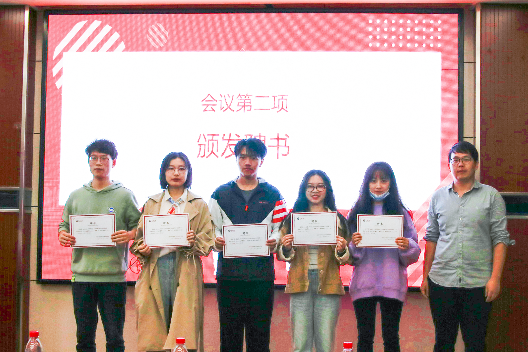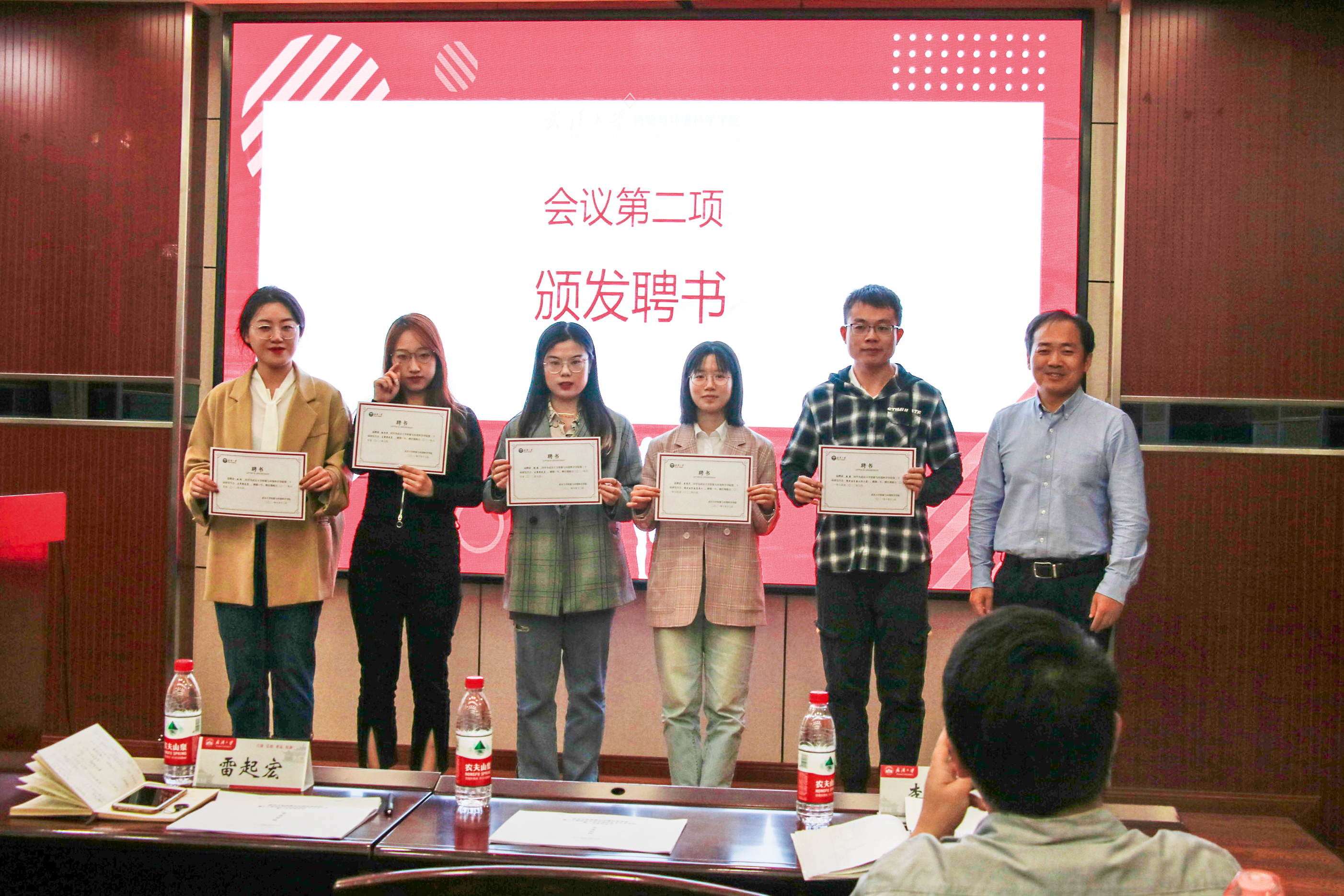 会议第二项:由院党委副书记雷起宏老师、院学工办主任马丽华老师以及院研究生辅导员李韩老师为第二十届研究生会骨干成员颁发聘书。