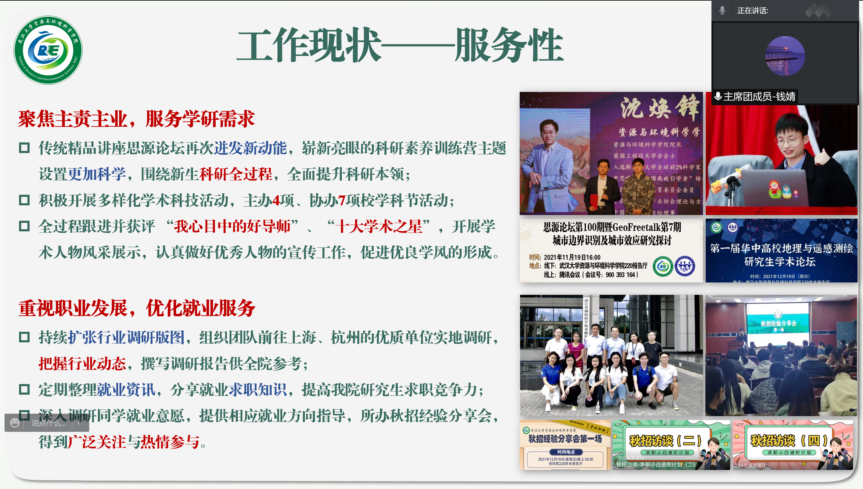 在服务性方面,一是聚焦主责主业,服务学研需求。传统精品讲座思源论坛再次迸发新动能,崭新亮眼的科研素养训练营主题设置更加科学;积极开展多样化的学术科技活动;认真做好“好导师”、“学术之星”等优秀人物的宣传工作,促进优良学风的形成。二是重视职业发展,优化就业服务。持续扩张行业调研版图,把握行业动态;分享就业求职知识,提高色情直播app