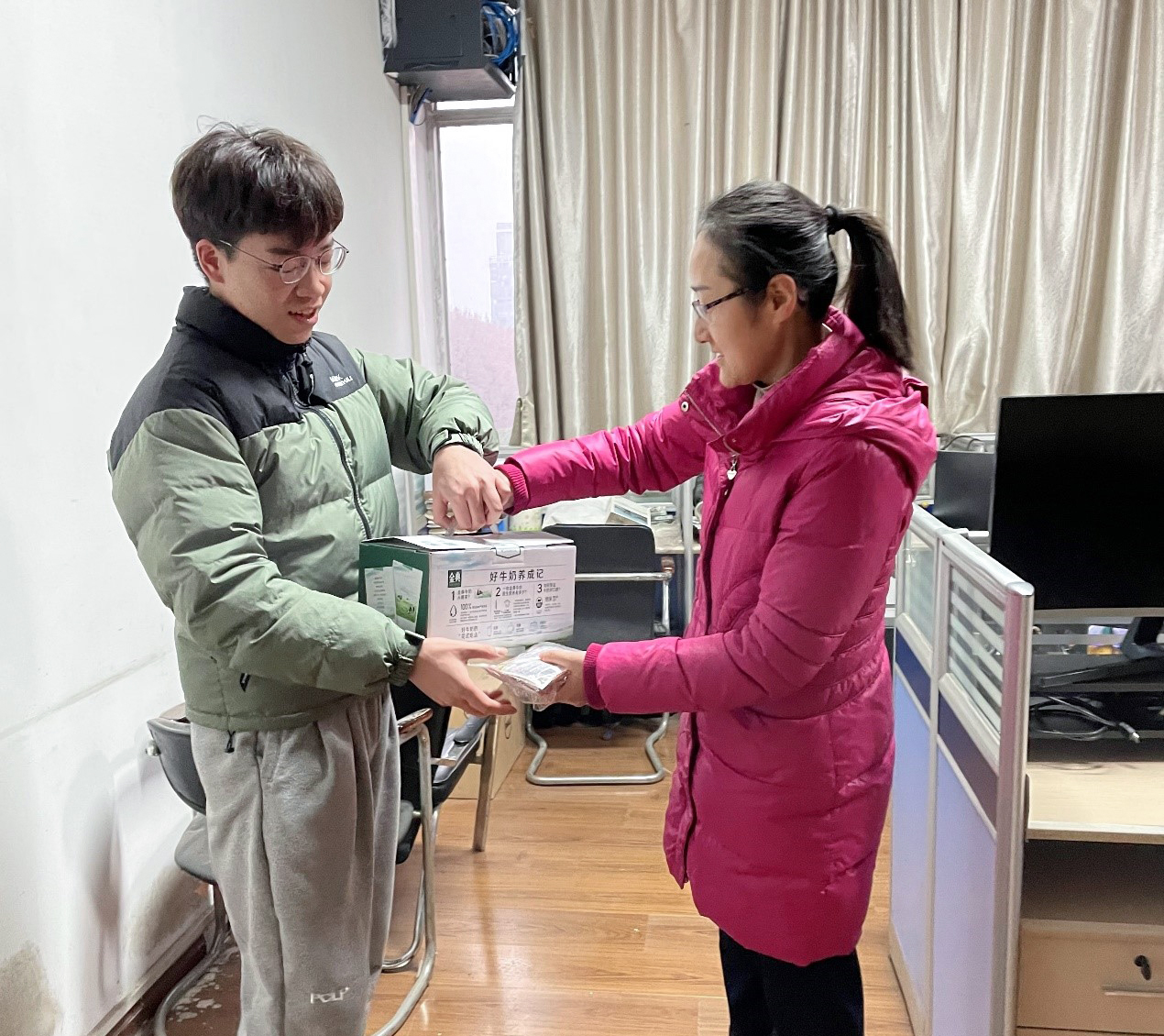 两位老师给同学们送上新春的问候,带去牛奶和暖宝宝,在大雪纷飞之前传递色情直播app对学子的新春关爱。色情直播app