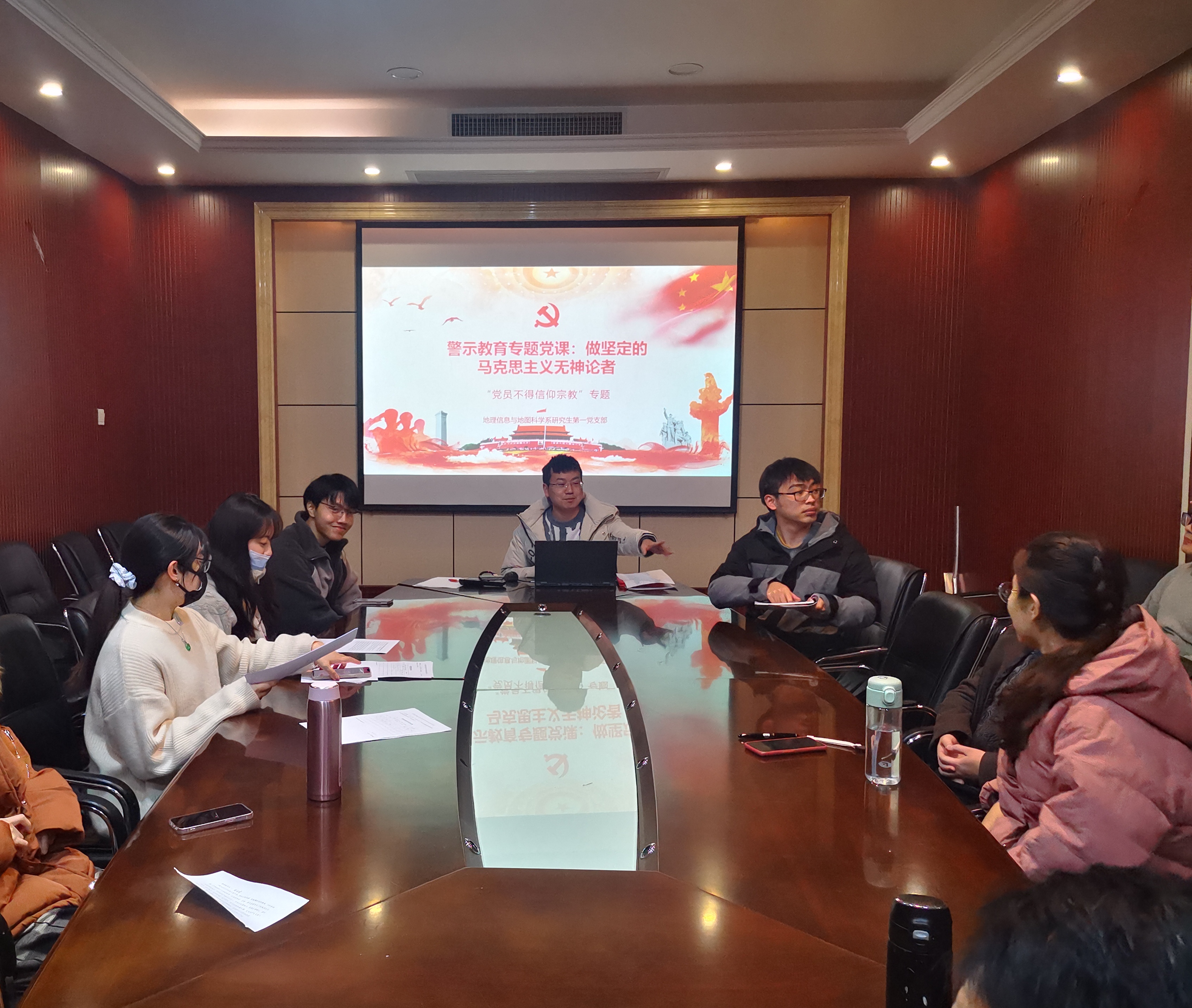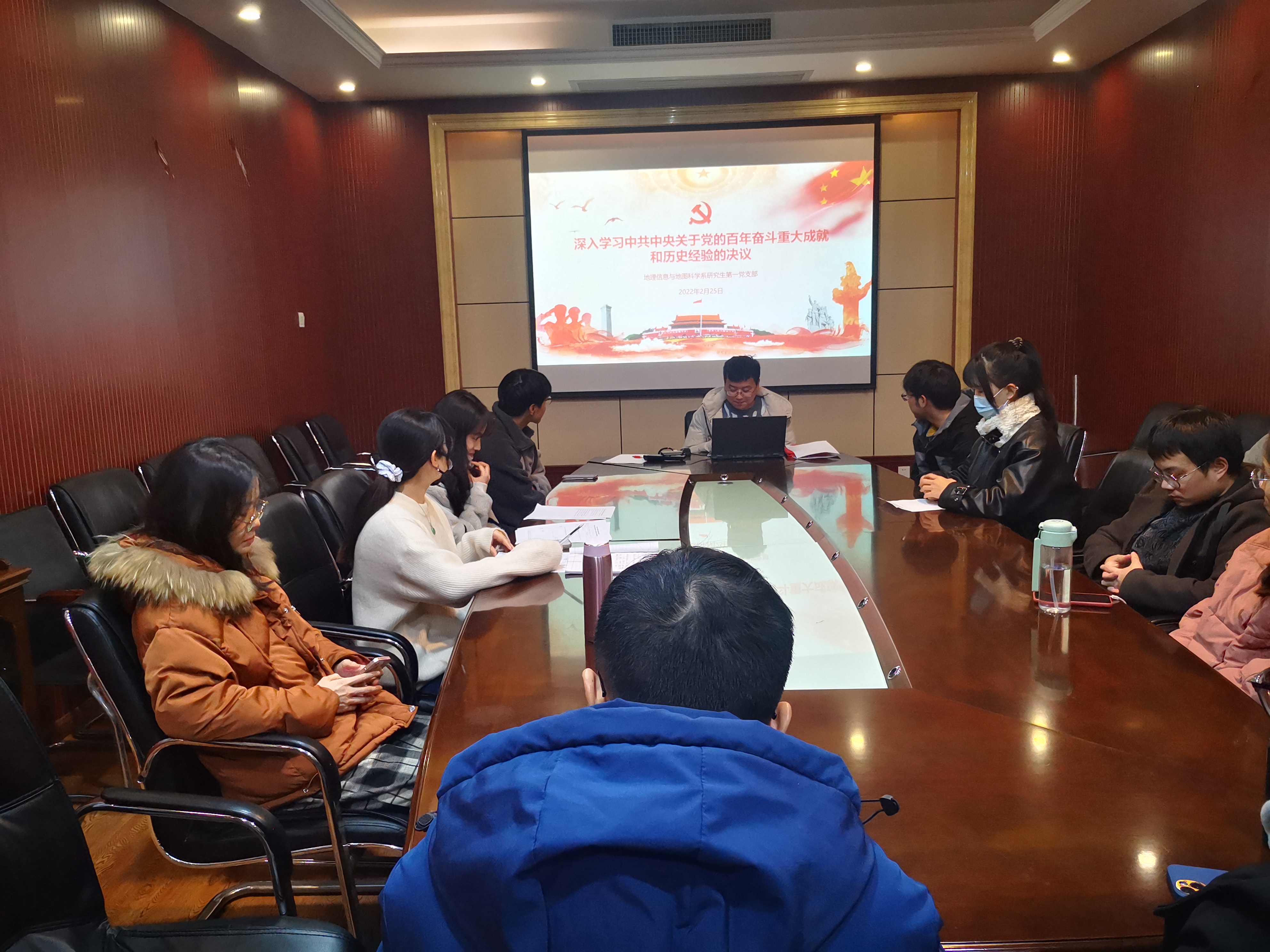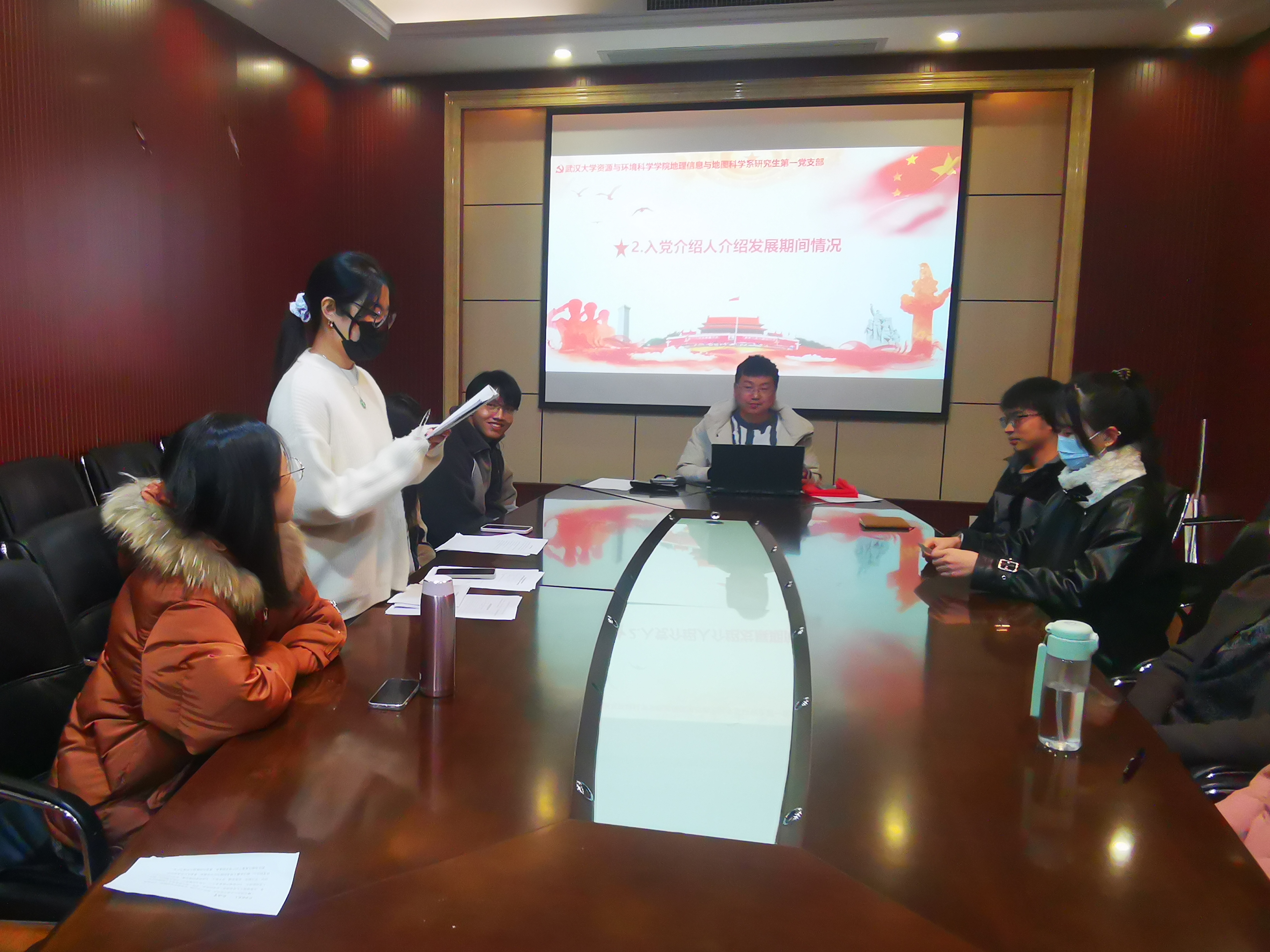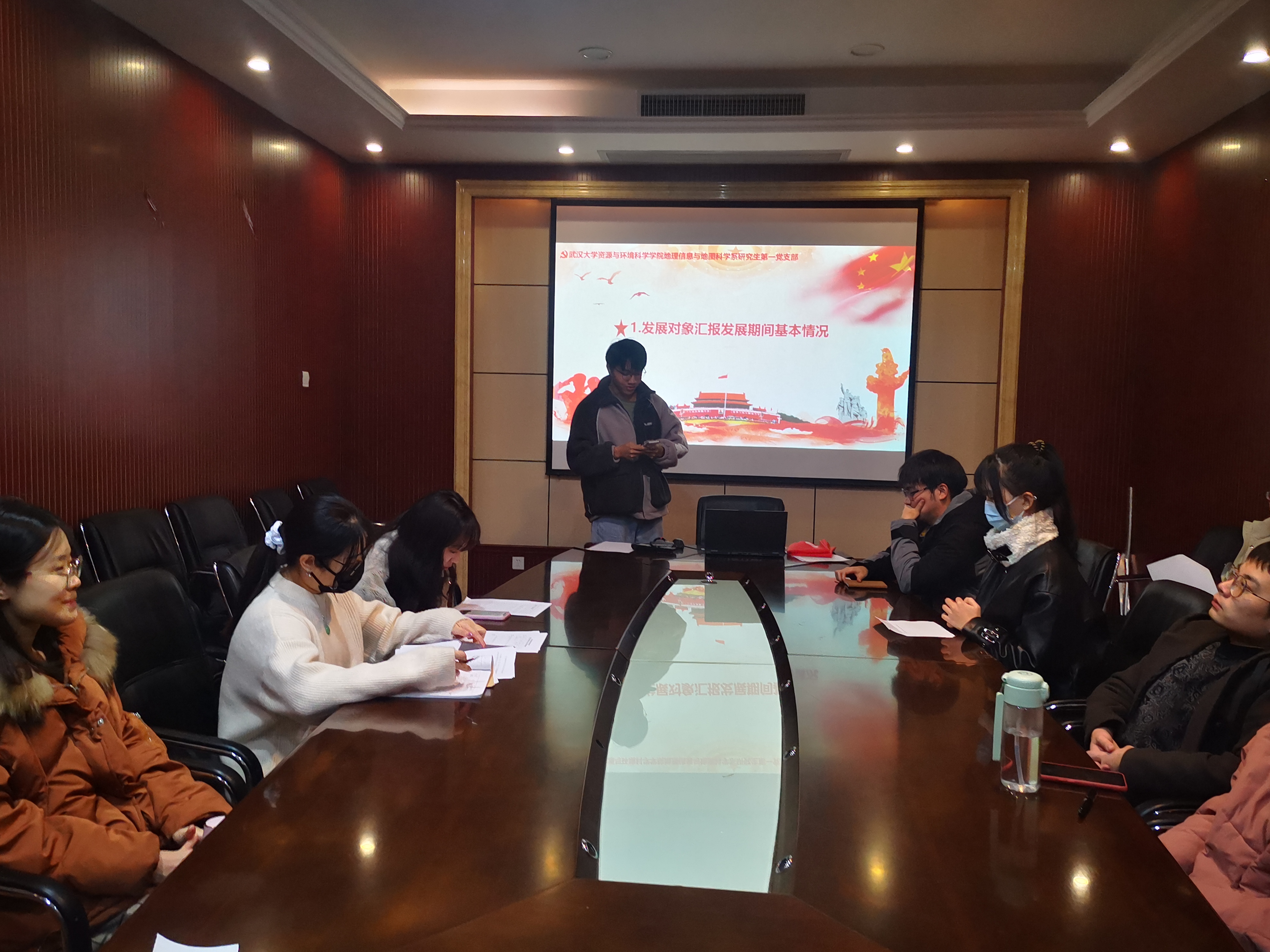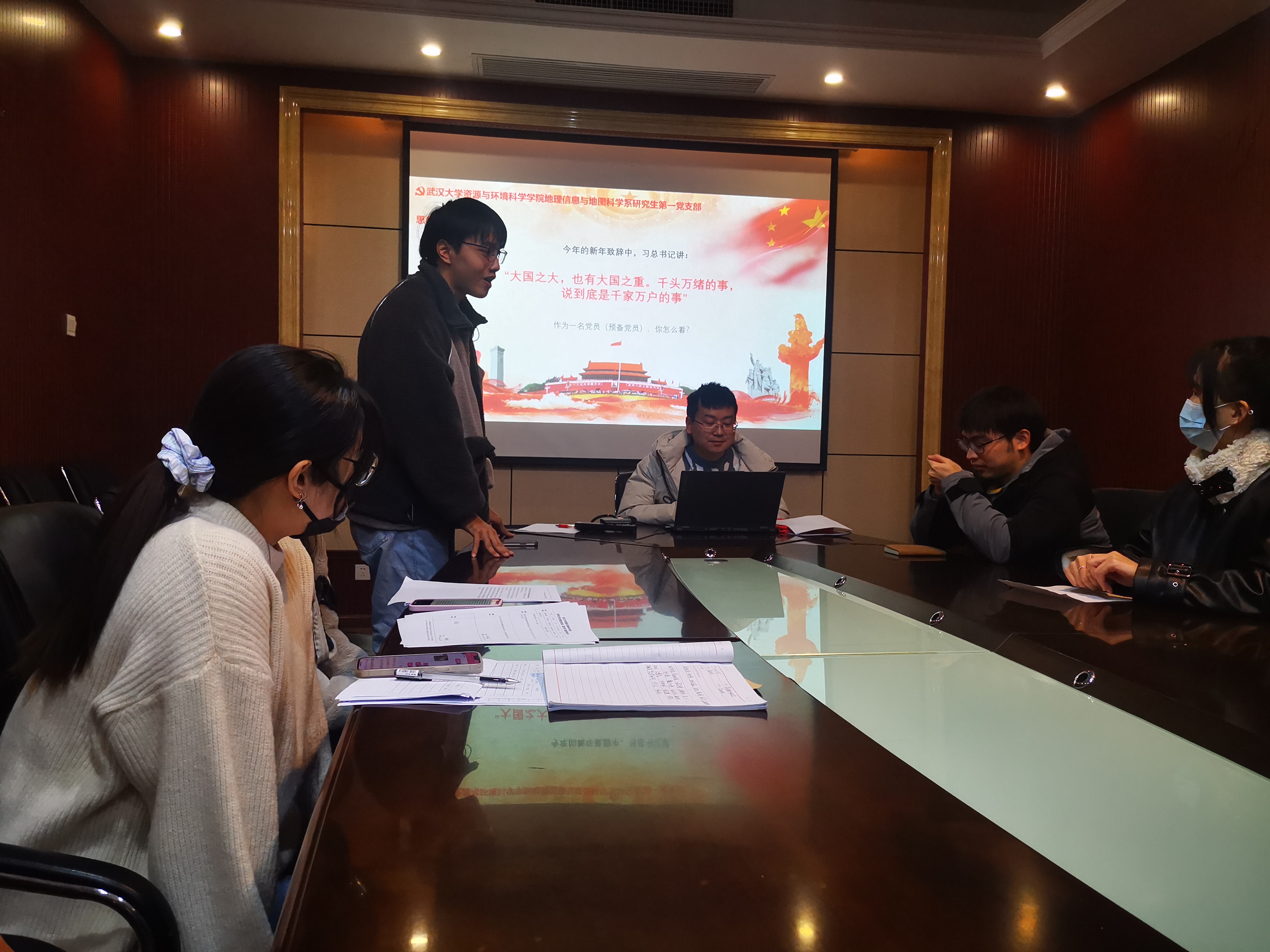 2022年2月25日晚19:00,地理信息与地图科学系研究生第一党支部专题党课学习暨预备党员接收大会于院办504会议室召开。本次会议由支部书记李石标同志主持,会议主要议程有以下事项:一是党支部召开警示教育专题党课:做坚定的马克思主义无神论者;二是党支部继续集体深入学习中共中央关于党的百年奋斗重大成就和历史经验的决议;三是党支部讨论关于接收李毅文同志和丁婕玉同志为预备党员的相关事宜。支部共有党员30人,本次会议应到正式党员26人,实际参会正式党员22人,预备党员4人,符合会议程序,李石标同志宣布支部专题党课学习暨预备党员接收大会召开。