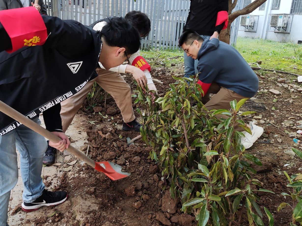 信息学部绿化环卫队的大力支持,该单位为活动提供了树苗和工具。在植树现场,大家三五成组,相互配合默契,场面繁忙有序、气氛活泼热烈。党员们搬运树苗、挥锹挖坑、填土栽种,相互协作、相互配合、有条不紊,展现出一片热火朝天的劳动场景。