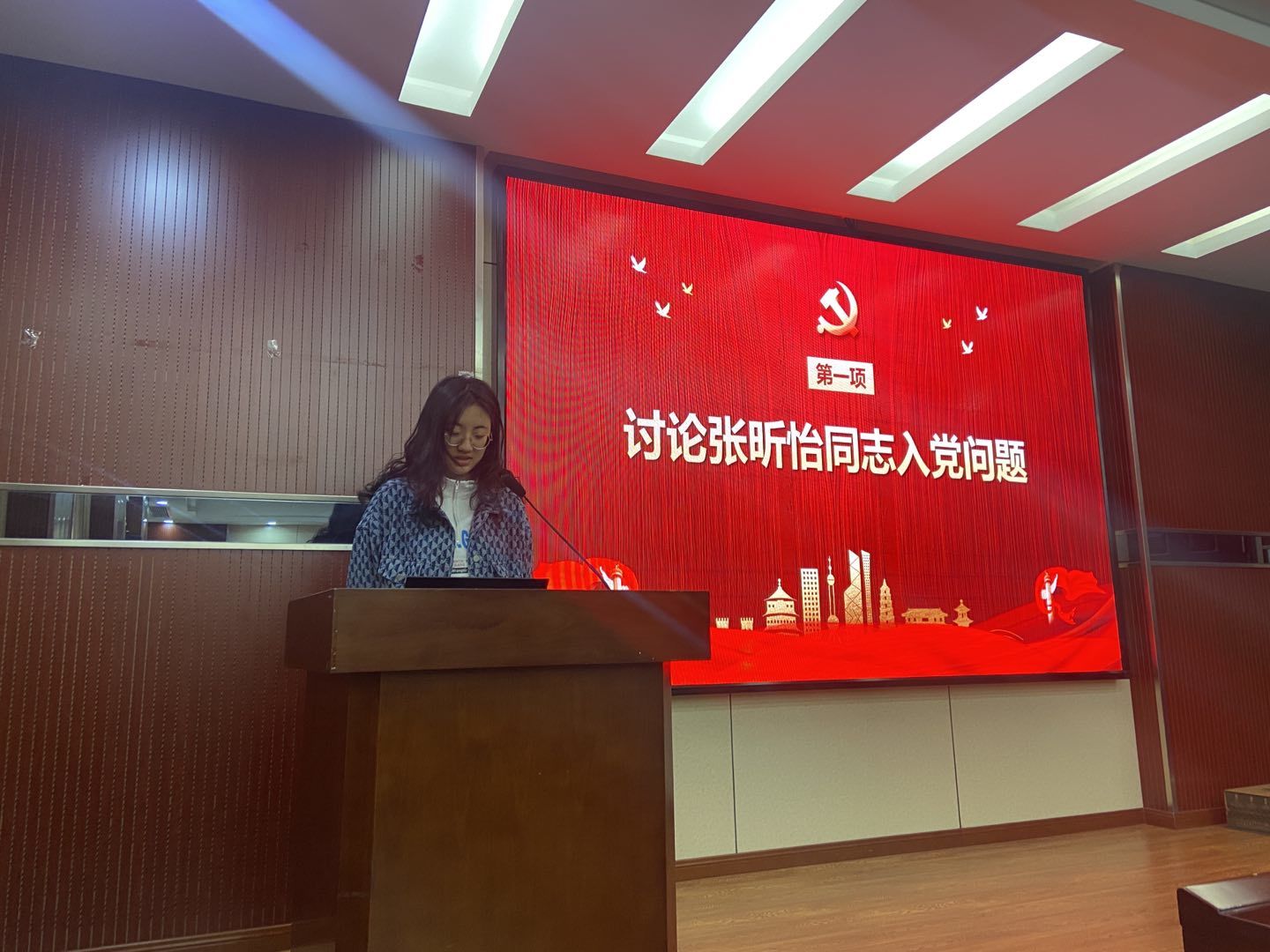 一是讨论发展对象张昕怡同志入党问题。首先,张昕怡同志对党的认识、入党动机以及个人情况等进行了详细汇报,接着其入党介绍人,党支部副书记以及多名与会党员发表意见,对张昕怡同志能否入党进行了充分讨论,各位同志一致认为张昕怡同志入党动机端正,思想积极上进,在工作中认真负责,积极参加各项活动,发挥了一定的模范带头作用,达到了成为党员的标准。经支部大会无记名投票表决,赞成张昕怡同志入党的人数超过应到会有表决权的正式党员的半数,同意接收其为预备党员。最后,张昕怡同志表态其将继续努力,改正不足,加强学习,争当一名合格的共产党员。
