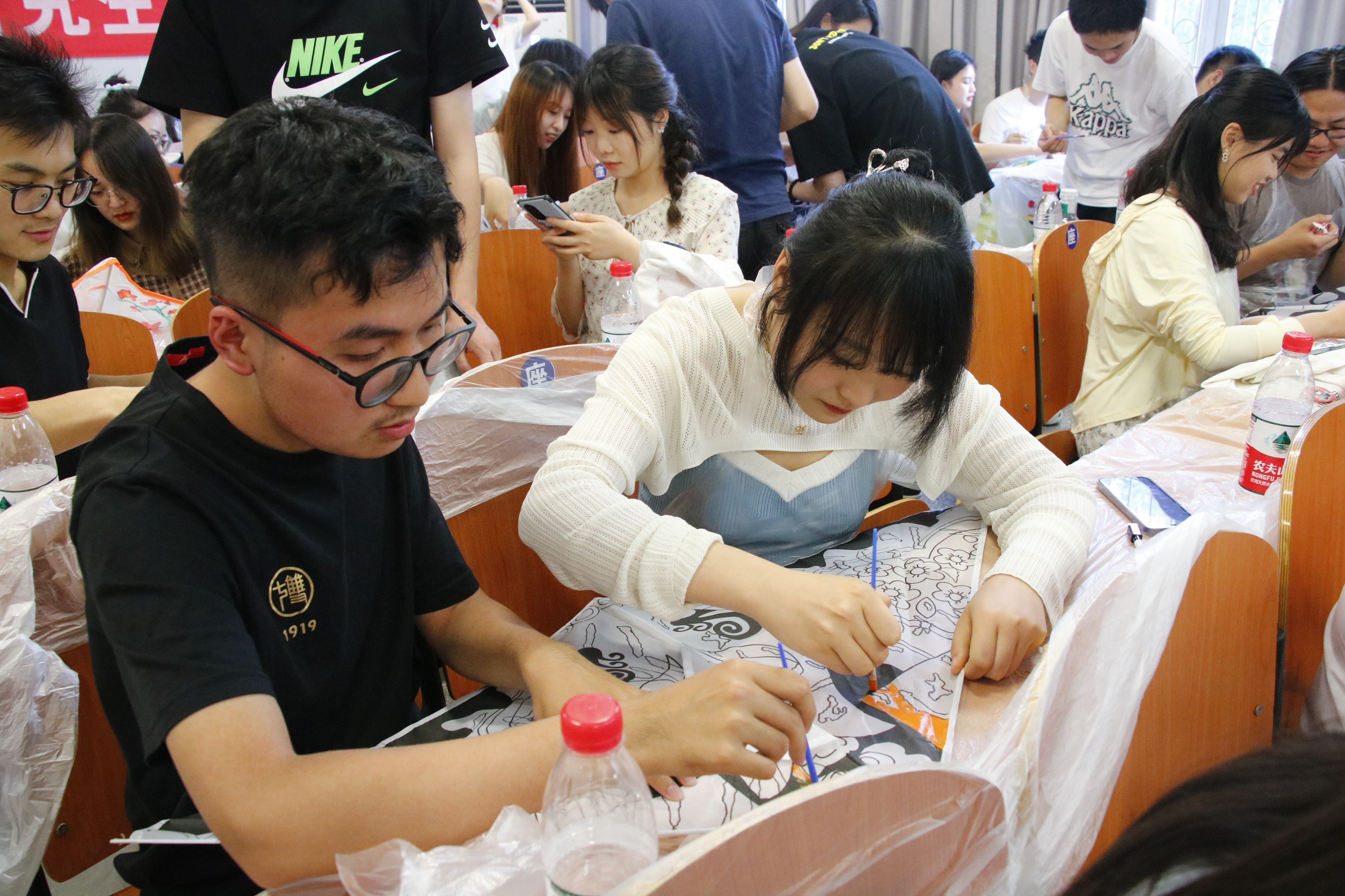 活动中期,大家自由组合,两两一组,一起团结协作,一边手持画笔,填涂着自己喜欢的色彩组合,绘制着属于自己的风筝,一边参与解忧,热心地帮助近期有烦恼的同学支招,就在这样一个其乐融融地氛围下,很快一个接着一个或色彩浓烈或可爱卡通或娇艳美丽的风筝出现在大家的视野里。
