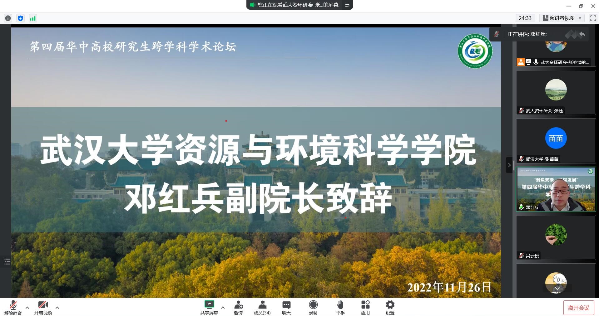 2022年11月26日,第四届华中高校研究生跨学科学术论坛于线上成功举办。本次论坛结合时代背景、关注发展需求,以“聚焦双碳目标,共谋绿色发展”为主题,收到了华中各高校优秀硕博研究生踊跃投稿,也得到相关领域专家学者的广泛关注。