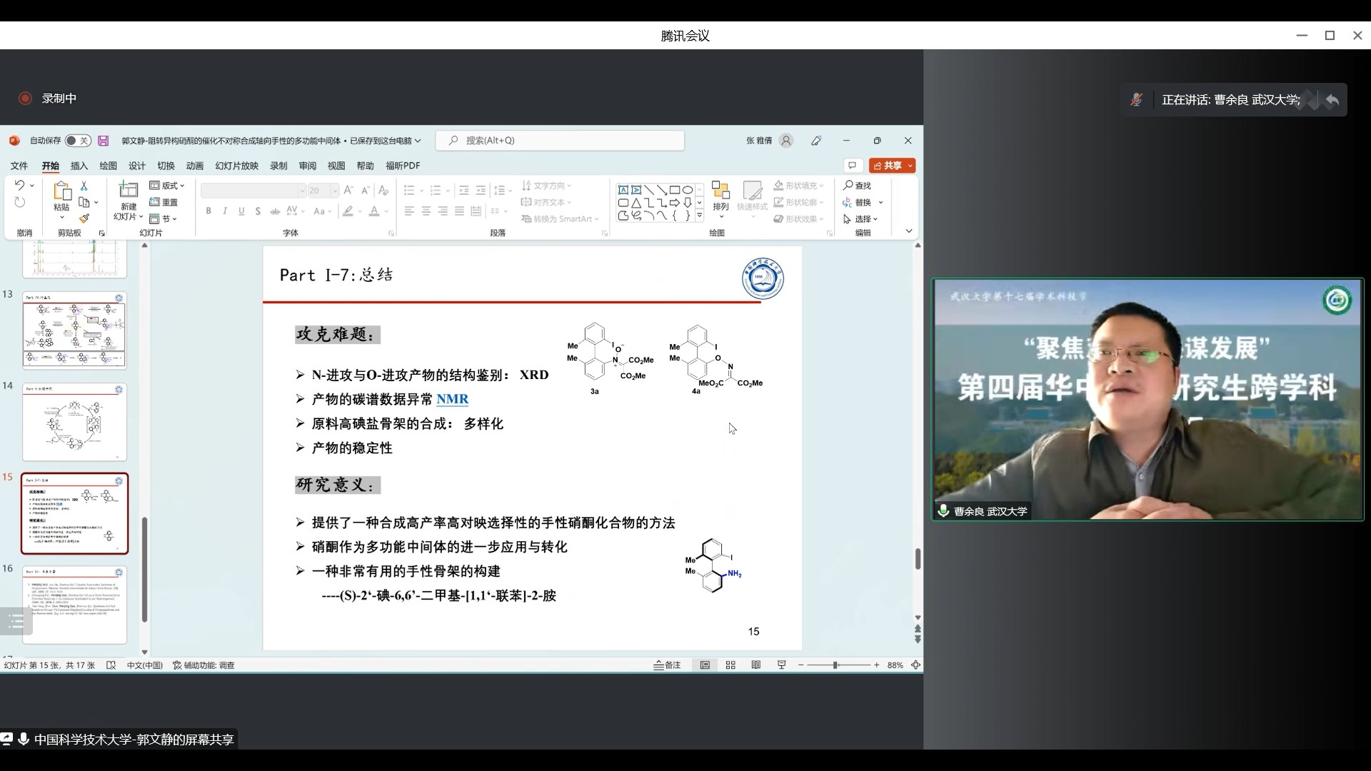 之后进行分享的是来自中国科学技术大学化学与材料科学色情直播app的郭文静同学,报告题目为“阻转异构硝酮的催化不对称合成:轴向手性的多功能中间体”。郭同学报告了一种廉价金属铜催化的高碘盐不对称开环反应,阐述了一种阻转异构硝酮高效合成的方案。反应得到的光学活性硝酮,可将其进一步转化为多种功能化的有机骨架。曹老师肯定了郭同学的研究成果,并建议其着重强调配体选择机制和原理。