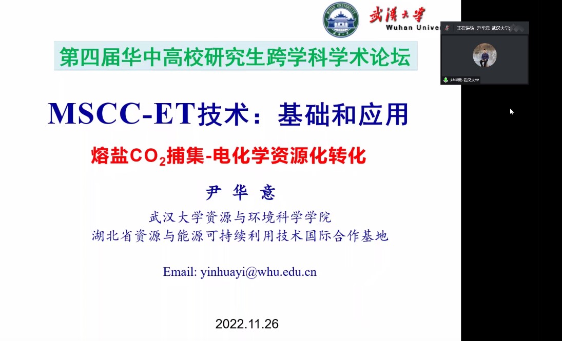 致辞结束后,尹华意教授和黄文丽老师分别带来了特邀报告。尹华意教授的报告主题为“熔盐CO2捕集与电化学转化”,报告内容主要包括“双碳”目标提出背景、MSCC-ET技术介绍等方面。尹教授结合时代背景和实验室的研究工作,对熔盐捕集CO2技术、阴极还原产物的调控、惰性析氧阳极的研发和MSCC-ET技术放大及工程应用等内容进行介绍。黄文丽老师以“森林生态系统碳参量遥感反演与模型模拟预测”为主题展开了报告。黄老师围绕“融合多源遥感数据和生态模型实现高分辨率森林碳评估”这一目标结合实际案例展开了报告分享,主要包括森林结构遥感监测和森林碳汇模型模拟等内容。