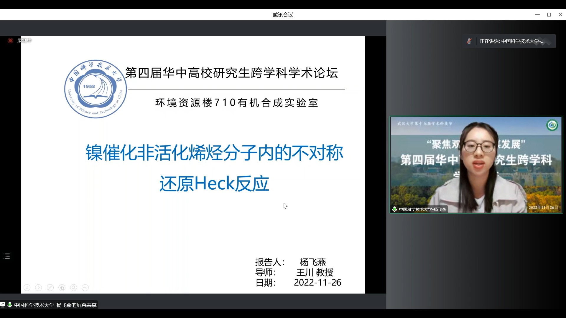 化学与分子科学色情直播app曹余良教授作为点评老师。会议伊始,来自中国科学技术大学化学与材料科学色情直播app的杨飞燕同学带来题目为“镍催化非活化烯烃的分子内不对称还原Heck反应”的报告。杨同学使用镍催化实现非活化1,1-二取代烯烃的分子内的不对称还原 Heck 反应,合成了一系列含有季碳手性中心的环状化合物,并在此反应中取得了优异的不对称诱导效果。曹老师肯定了杨同学的研究方向与工作内容,并建议杨同学今后汇报中应更加突出研究的重点、创新性与目的性。
