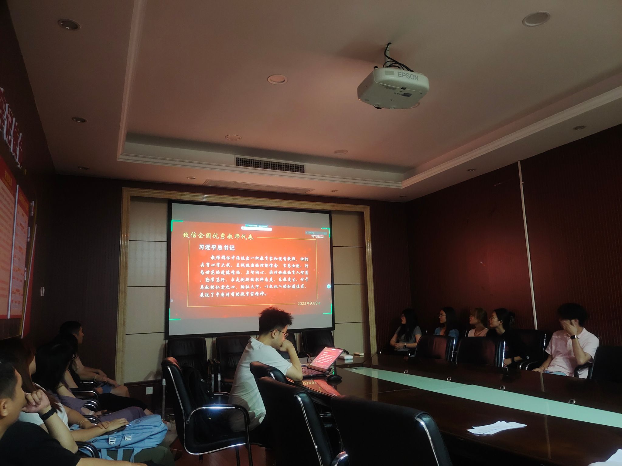 会议第三项,主题党日活动。首先,支部书记周宇氚同志带领大家观看了红色影片《长津湖》的剪辑短片。随后,结合刚刚过去的第39个教师节,现场党员同志又共同观看了《习近平的教师情》专题教育学习视频,切身体会、感悟习近平总书记的尊师重教情怀。