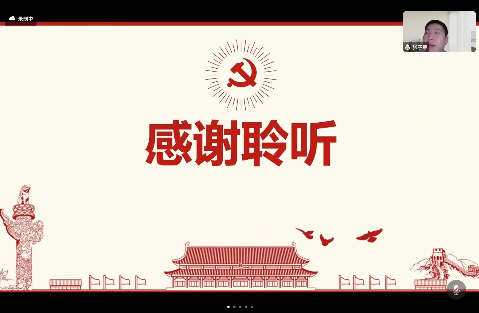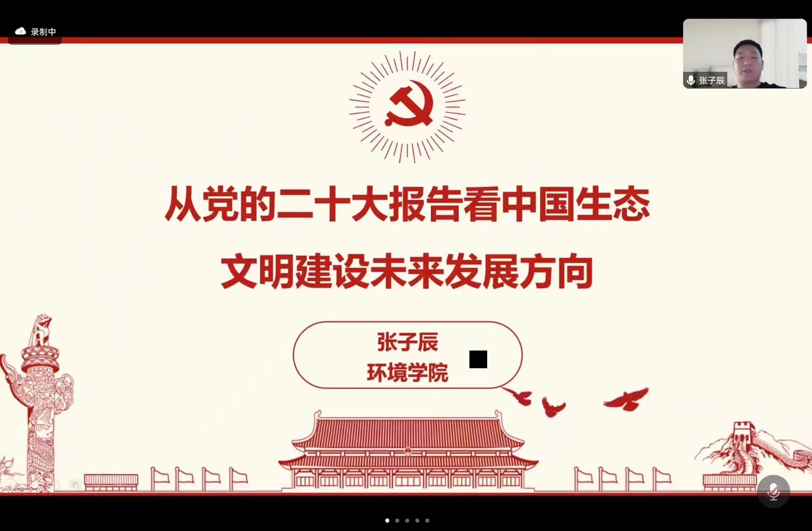 会议的最后,张子辰同学号召与会党员们从党的二十大以及相关政策文件中汲取党对生态文明建设的最新思想,作为一名环境人,有责任和义务去为生态环境建设贡献自己的力量。