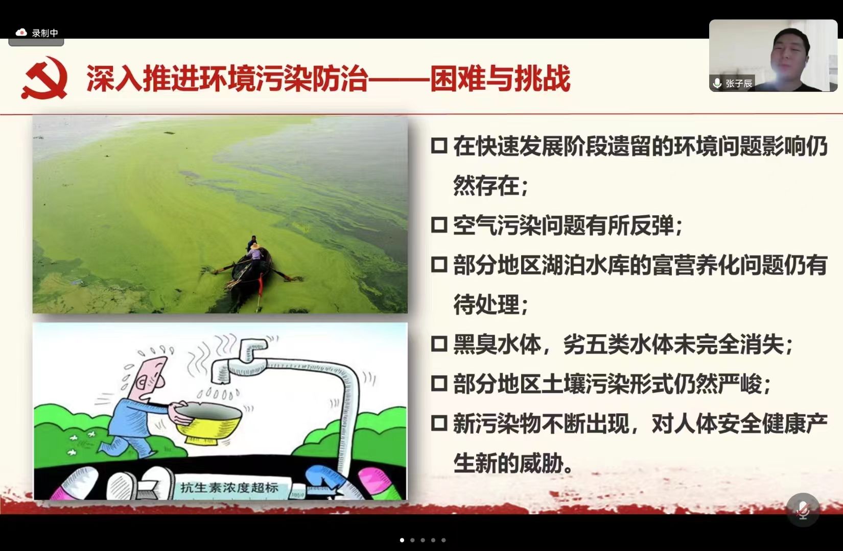 对于未来生态文明建设的方向,张子辰同学向与会党员介绍了污染防治的关键三点:①坚持精准治污、科学治污、依法治污,持续深入打好蓝天、碧水、净土保卫战;②加强污染物协同控制,基本消除重污染天气,统筹水资源、水环境水生态治理,推动重要江河湖库生态保护治理,基本消除城市黑臭水体;加强土壤污染源头防控、开展新污染物治理;③提升环境基础设施建设水平,推进城乡人居环境整治,全面实行排污许可制,健全现代环境治理体系,严密防控环境风险,深入推进中央生态环境保护督察。