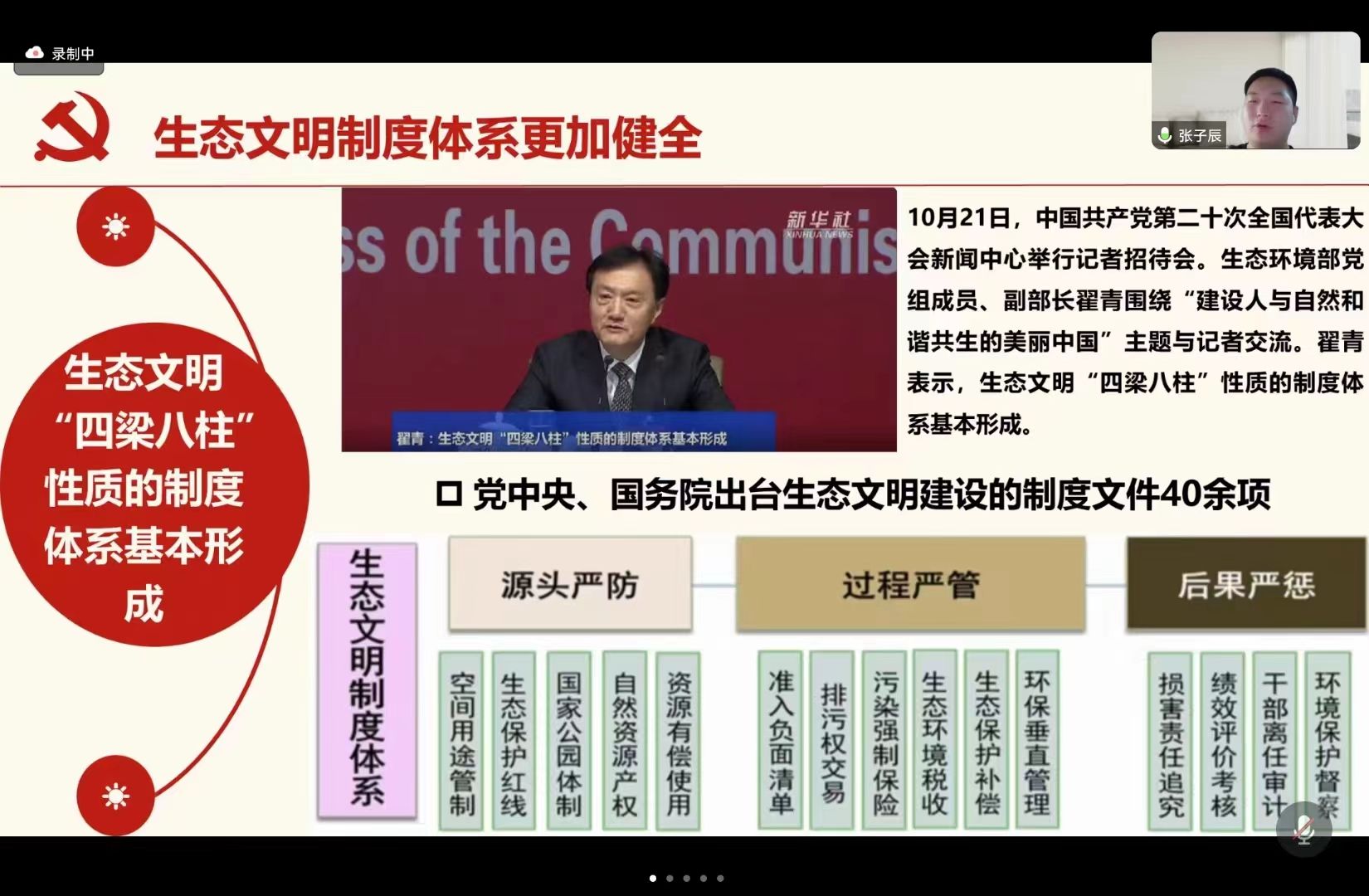 环境科学与工程系研究生第四党支部于2023年11月27日晚上7点30分以腾讯会议形式召开学习分享会暨支部组织生活会。本次会议由支部书记邓萌杰同志主持,特别邀请到清华大学环境色情直播app博士生讲师团的张子辰同学为支部成员讲课。宣讲内容为:从党的二十大报告看我国未来生态文明建设未来发展方向。会议应到正式党员24人,实到正式党员21人,可以开会。