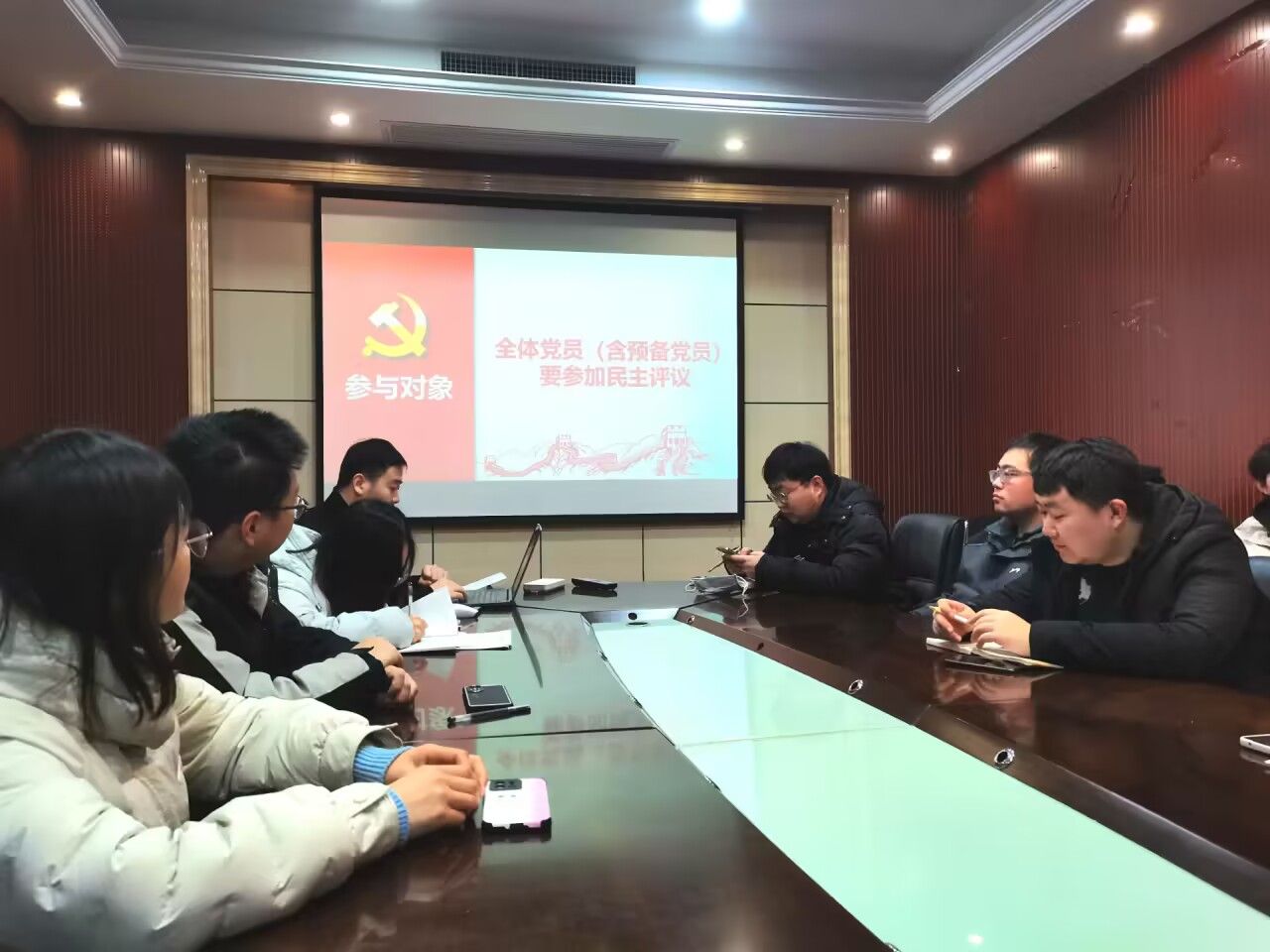 504会议室开展了民主评议会暨组织生活会。本次会议由党支部书记王涵植同志主持,共有22名同志参与本次会议,其中,正式党员20人,预备党员2人。有表决权的到会人数超过应到会有表决权人数的半数,符合规定人数。