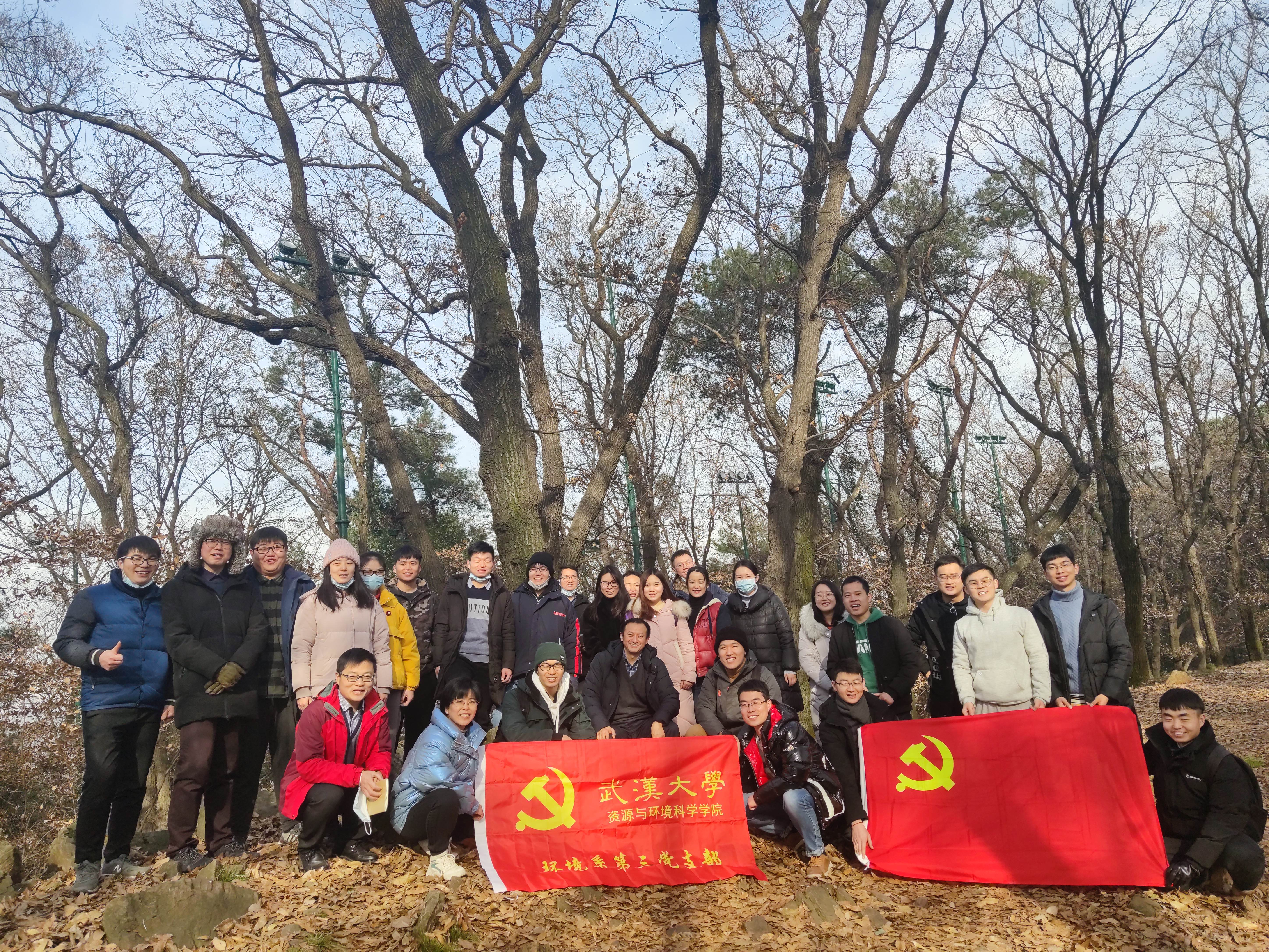 同学们在珞珈山上听汪老师讲党课