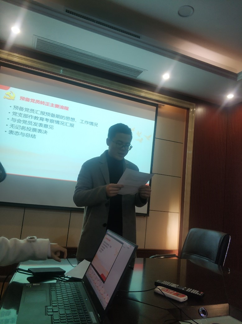会议开始,李思宇同志宣读《转正申请书》,汇报了自己在预备期间的表现,总结了在思想、学习、生活、工作上的进步,指出自身仍需改进的地方并提出今后的努力方向,郑重地向党组织提出转正申请。