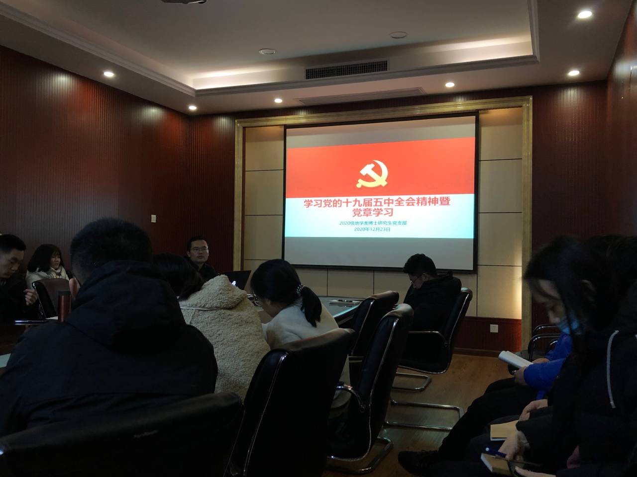 2020级地学博士研究生党支部预备党员转正大会暨学习党章主题党日于院办504召开,会议讨论并通过了李思宇同志、郑传帮同志和李亚静同志按期转为正式党员的申请。本次会议由宣传委员顾江岩同志主持,本次会议应到正式党员20人,预备党员3人;实到正式党员14人,预备党员3人,请假3人,未到3人。此外,4名入党积极分子和发展对象也参与了此次会议。