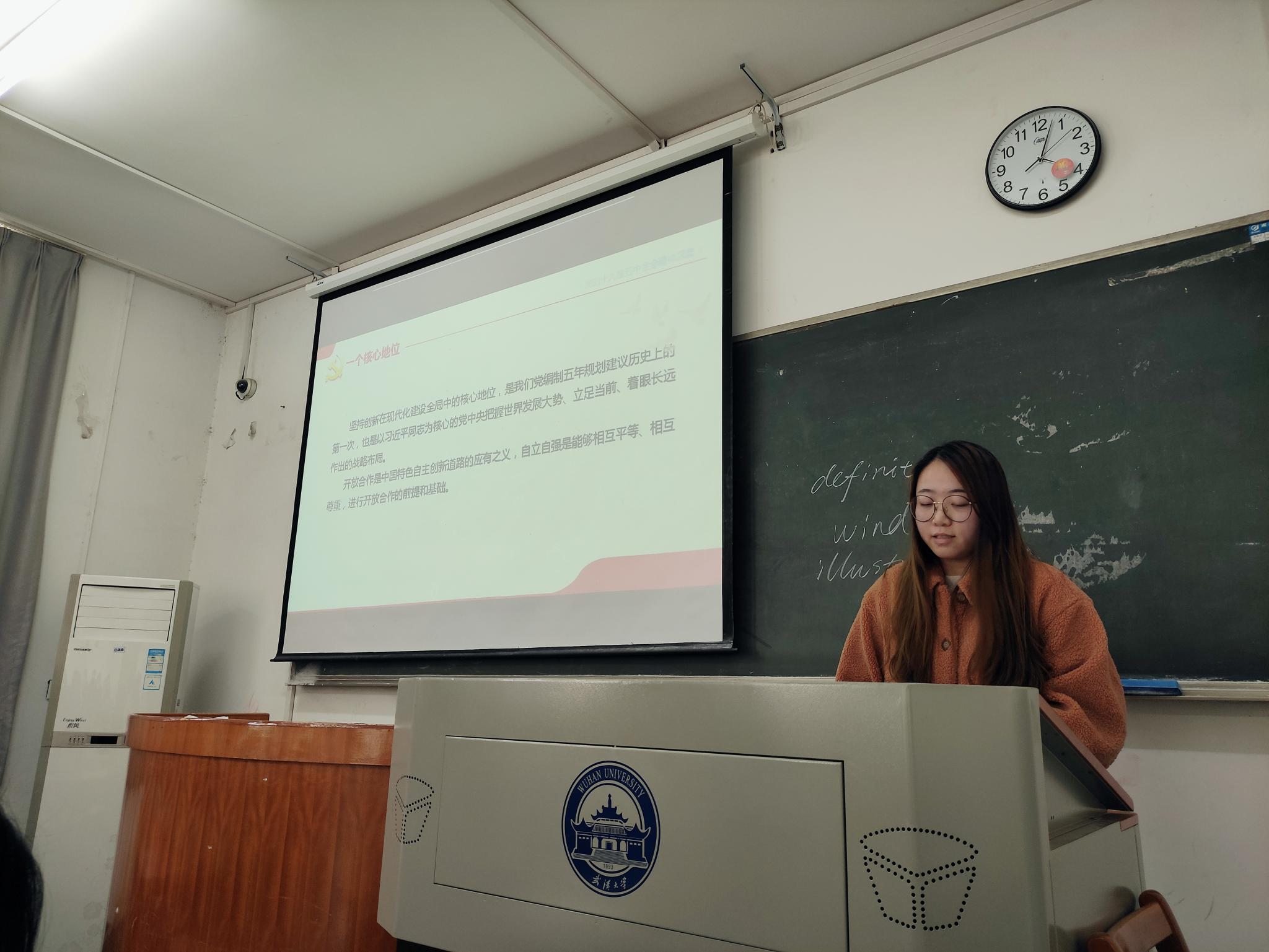 首先,包雨睿同志从工作回顾、我国发展环境面临的深刻复杂变化和远景目标三个方面学习全会内容,并从一个核心地位、三个“首次”、一个重大判断这三个“亮点”角度带领大家学习规划《建议》。各位同志围绕“学习贯彻党的十九届五中全会精神” 积极讨论和发言交流,发表了自己的学习心得体会。大家认为,站在“两个一百年”奋斗目标的历史交汇点,“十四五”规划开新局,谋新篇,让我们更加坚定制度自信,为实现伟大梦想提供了根本遵循,为夺取全面建设社会主义现代化国家新征程的胜利注入强大思想和行动力量。大家纷纷表示作为学生党员更应该担负起自己的职责,发挥好模范带头作用,提升为群众服务的本领。要胸怀“两个大局”,找准人生定位与奋斗目标,把个人际遇融入时代发展大局,做“十四五”时期的奋进者、开拓者、建设者,为夺取全面建设社会主义现代化国家新胜利贡献出自己的力量。