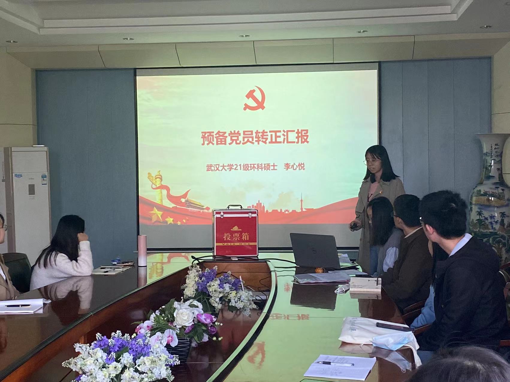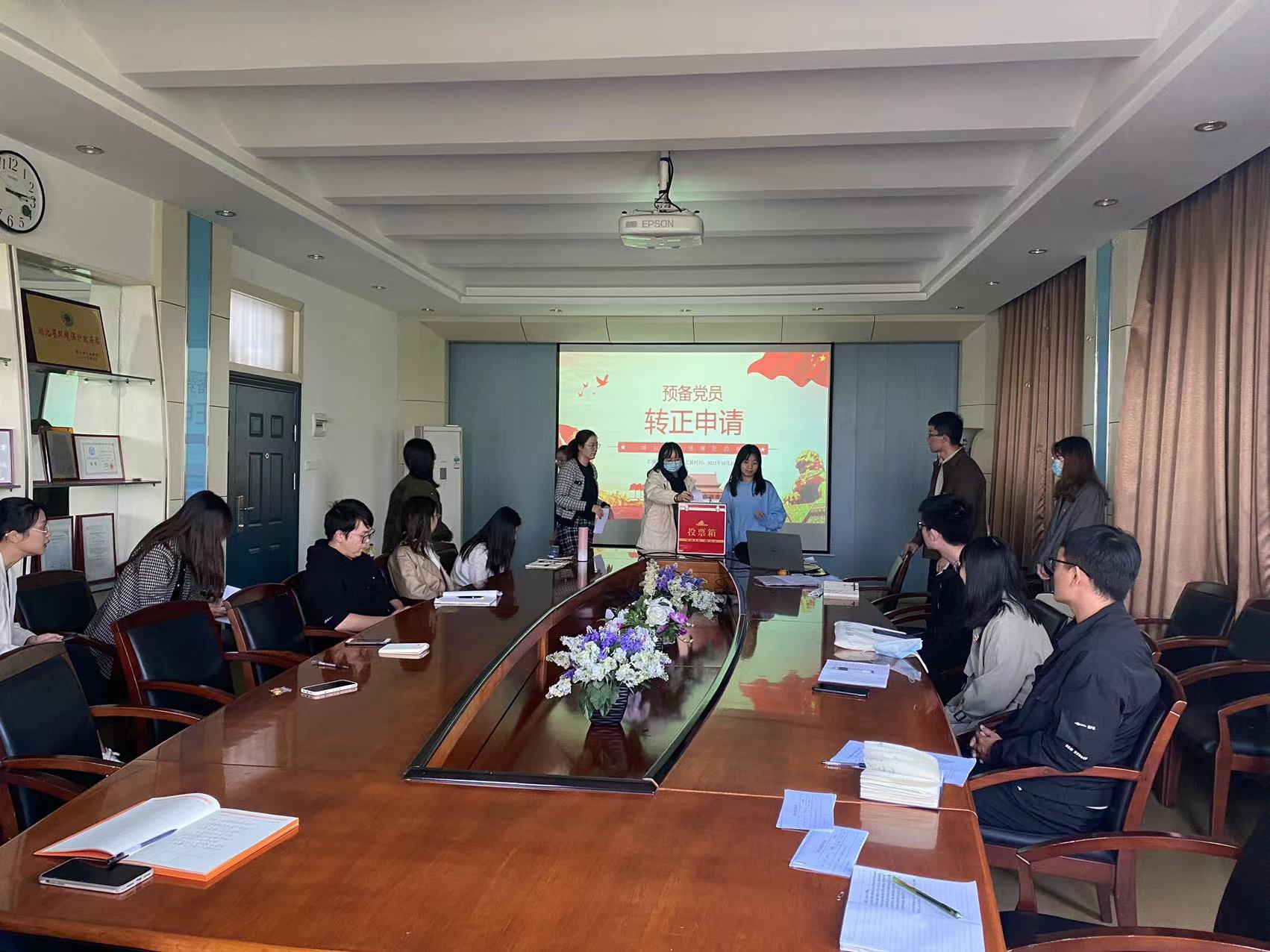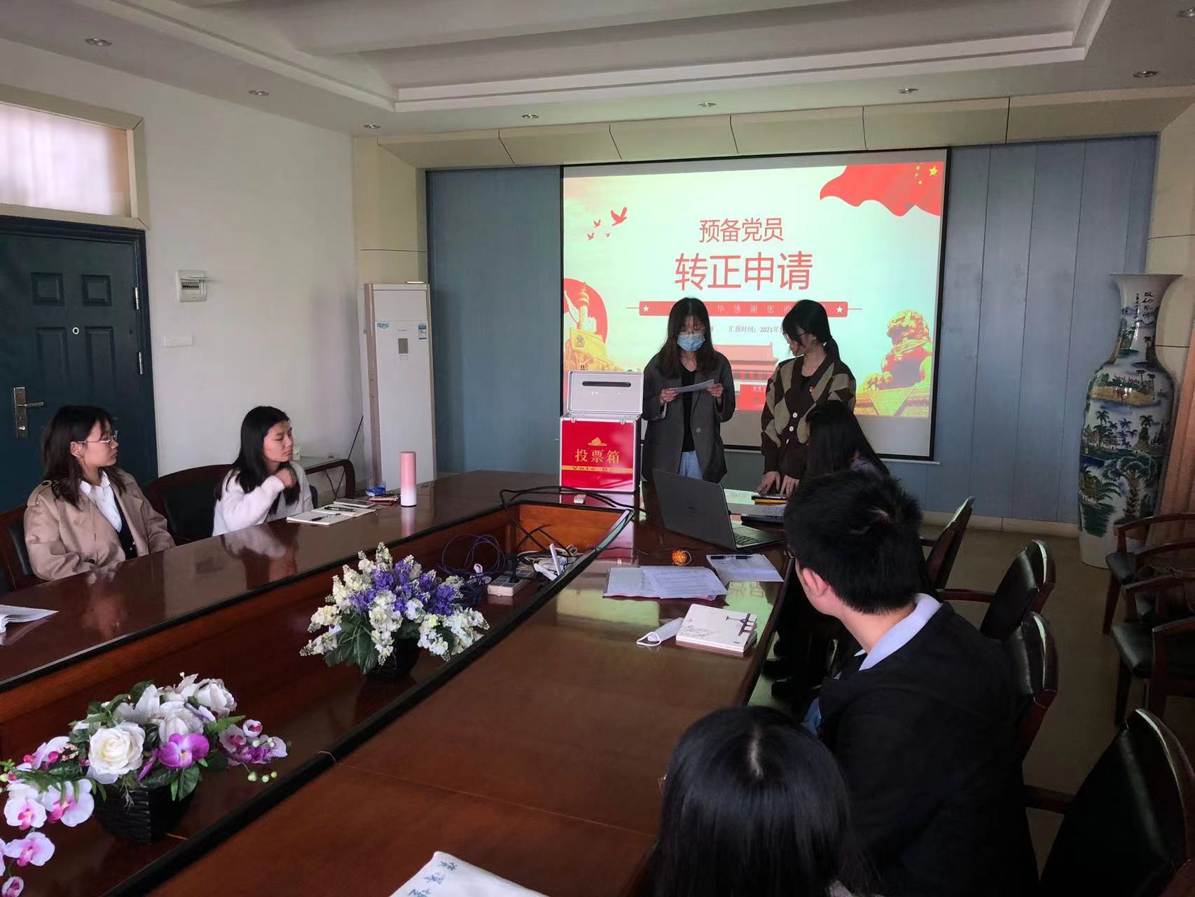 预备党员李翱、李心悦同志分别向党组织汇报了个人履历、在预备期间的表现、入党动机以及不足和改进措施等需要对党说明的问题;再由各自第一考察人和第二考察人分别介绍转正申请人在预备期间的表现情况并一致同意如期转正;接着由支委会代表朱磊同志报告转正申请人在预备期间的教育考察情况;报告完毕后,与会党员积极发表意见;最后进行正式党员无记名投票。投票结果为全员赞成,党支部同意两名同志按期转为中共正式党员。李翱、李心悦两名同志均表示将更加严格要求自己,及时反省,争取早日取得更大的进步。