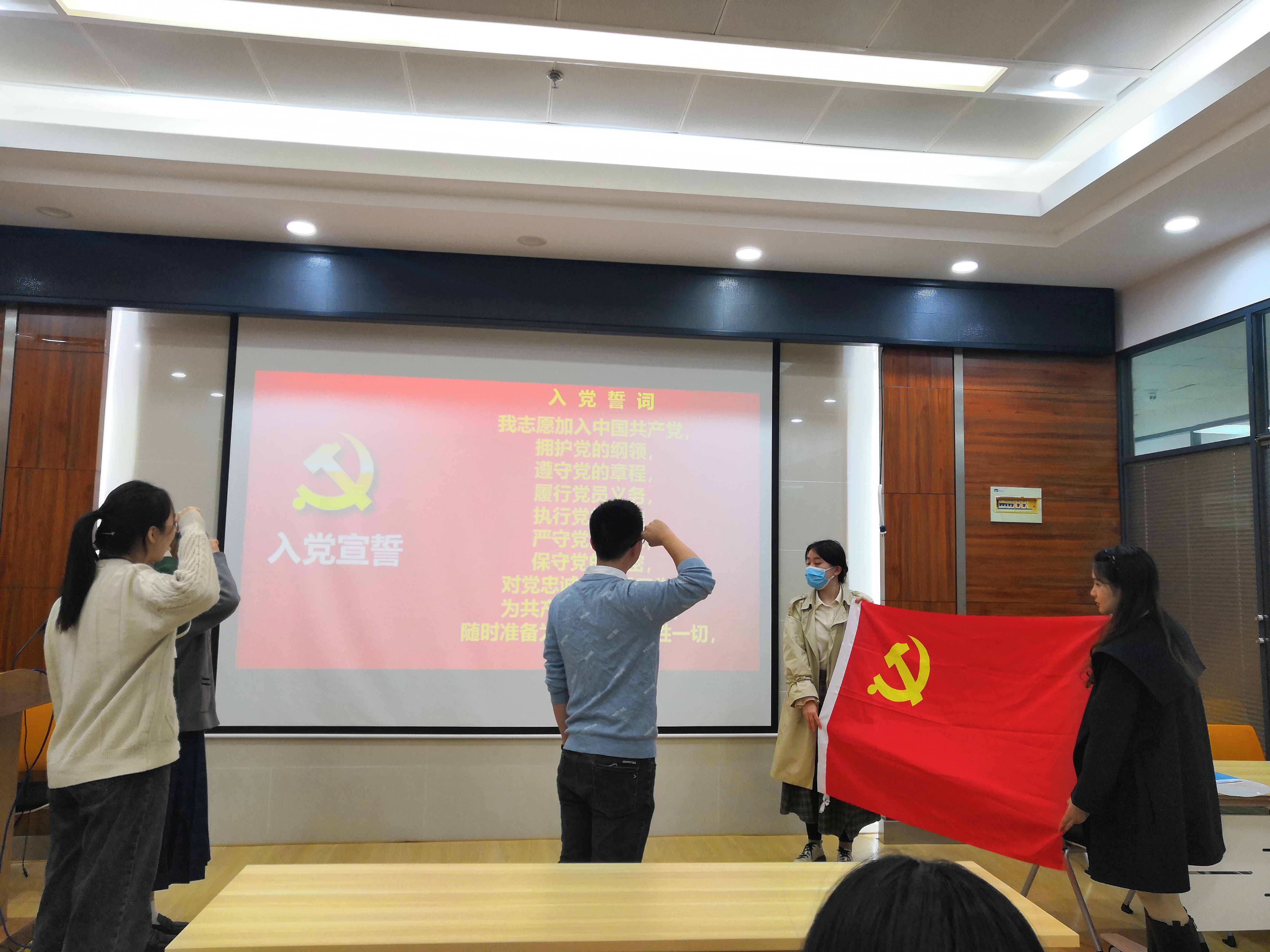 (六)会议第六项,入党宣誓。党支部书记程鹏同志带领董玥、邵丽冰、张舒瑾三名同志进行入党宣誓。