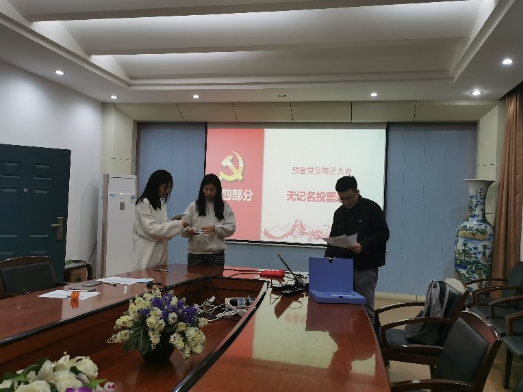 接下来,由李燚同志的培养考察人周佳佳同志与莫昭洪同志汇报考察情况,对李燚同志预备期间的各方面表现给予了肯定,同意其按期转正。与会党员也对李燚同志的转正申请进行了充分的讨论。随后由正式党员进行无记名投票并现场公示投票结果,经表决,李燚同志得到党支部大会的一致认可,同意其按期转为正式党员。