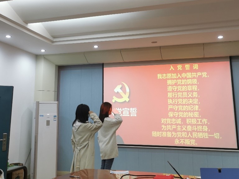 最后,李燚同志对本次会议的表决结果发表了感想,并在组织委员樊玉鑫同志的带领下,重温入党誓词。至此,地理信息与地图科学系研究生第六党支部预备党员转正大会到此结束。