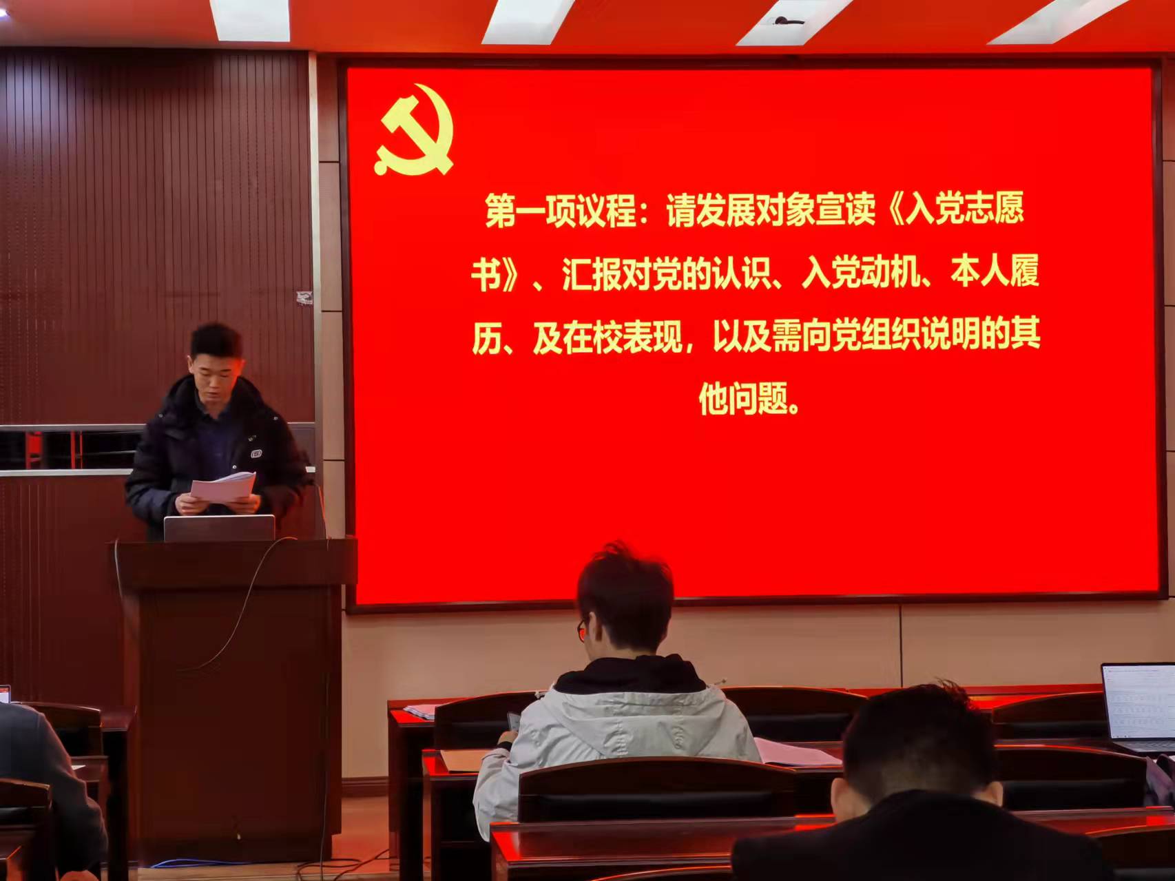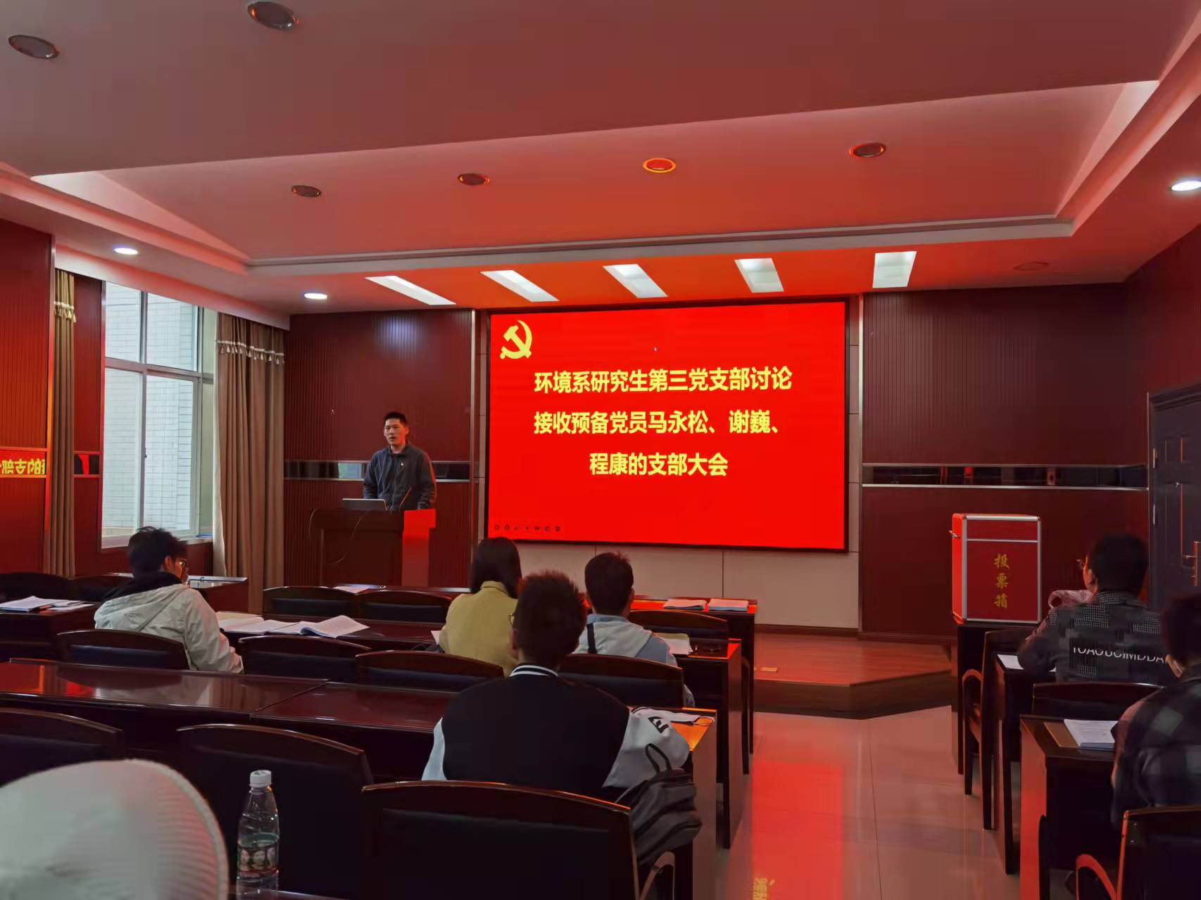 然后进行环境科学与工程系研究生第三党支部讨论接收马永松、谢巍、程康为预备党员的支部大会。