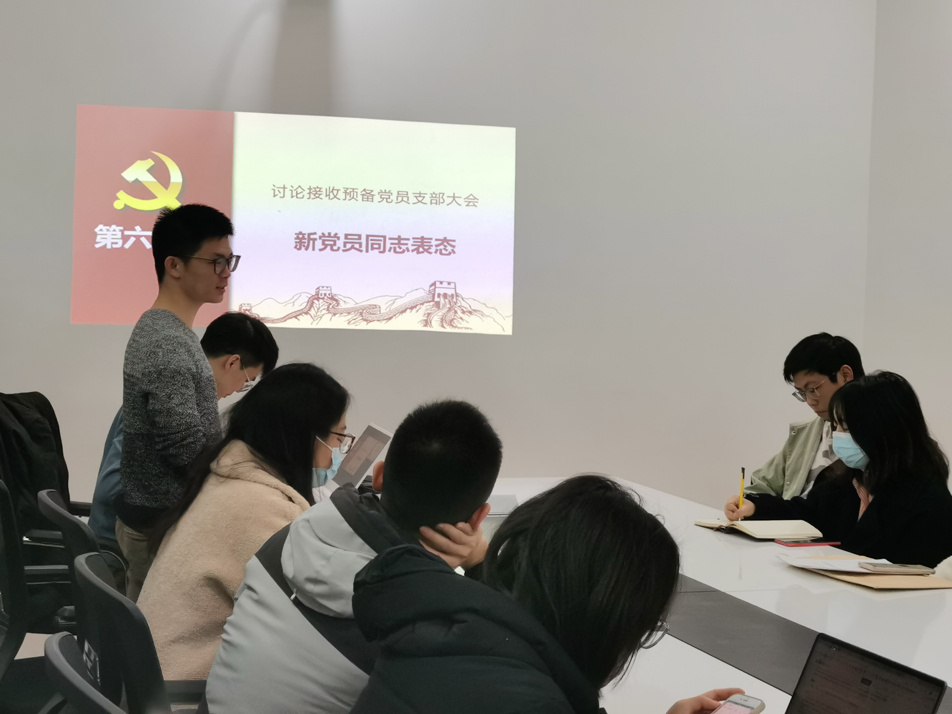 会议第一项,支部对接收李晓忠同志为中共预备党员进行讨论。首先,李晓忠同志汇报了基本情况、入党动机;其次,入党介绍人介绍有关情况,表达了对李晓忠同志入党的建议,推荐其入党;随后,苏会钰同志代表支委会报告审查情况:李晓忠同志符合发展要求;然后与会党员发表意见,正式党员进行投票,全票通过同意接收李晓忠同志为预备党员;最后,新党员同志李晓忠表态,表达了时刻向党组织看齐,严格要求自我的坚定信念。