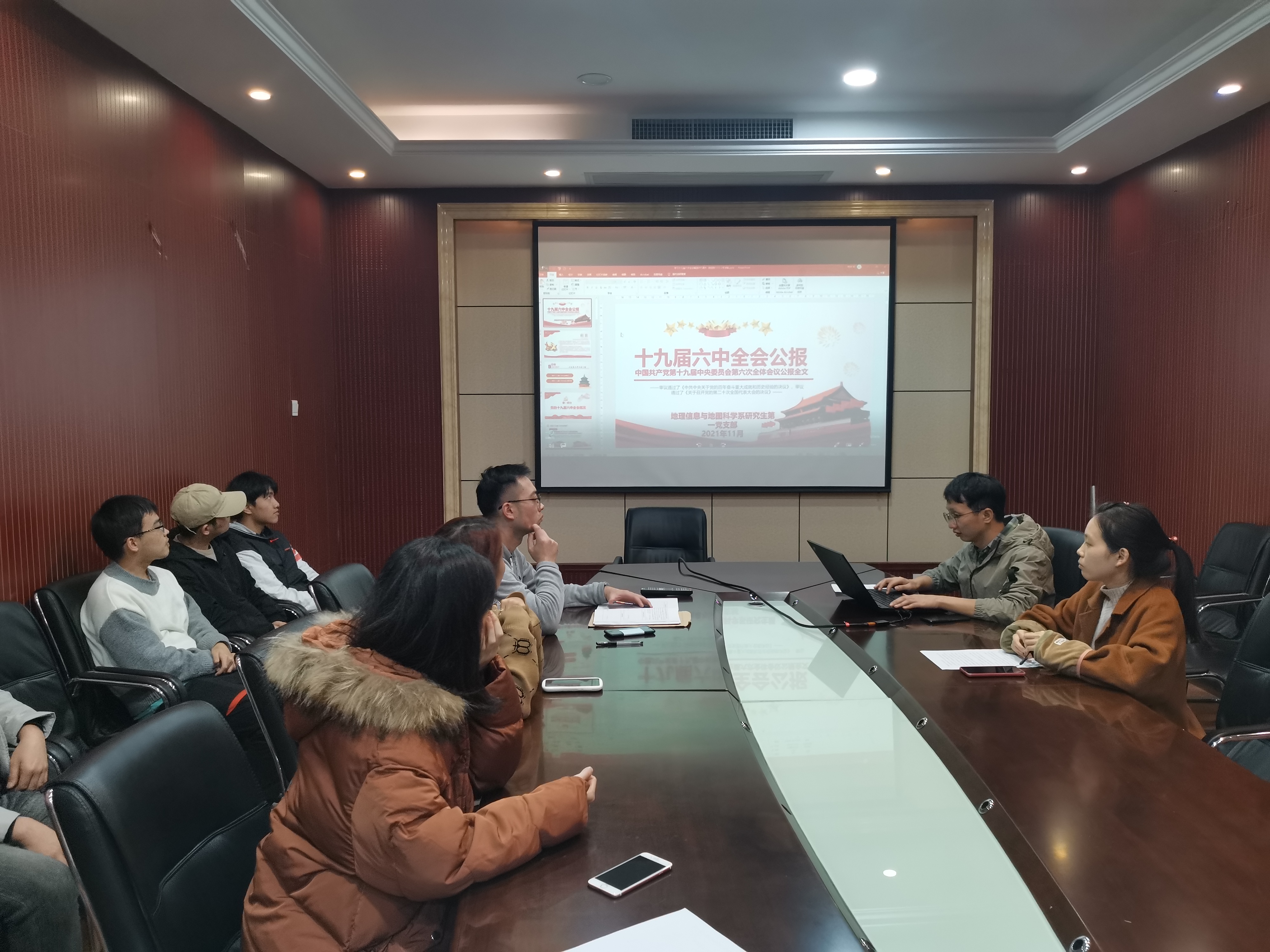 20211126日晚19:00,地理信息与地图科学系研究生第一党支部预备党员转正大会于院办504会议室召开。会议主要议程有以下两项:一是支部集体学习十九届六中全会的会议精神;二是党支部讨论了预备党员何文文和程颉同志转正相关事宜。本次会议由支部副书记杨任飞同志主持,本次会议应到正式党员21人,参会正式党员19人,预备党员3人。