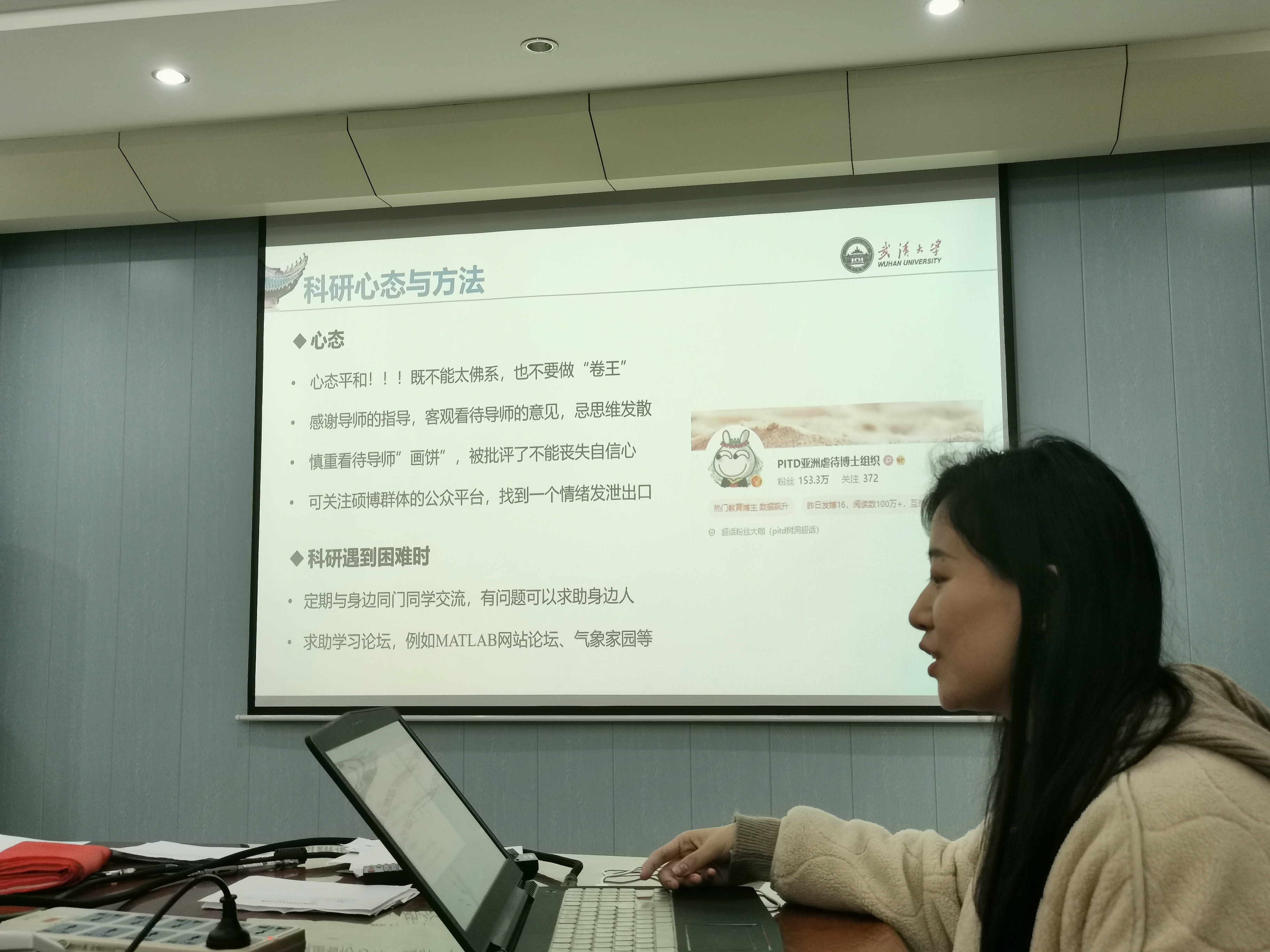首先,张凡一同志从科研基础、时间管理、科研心态与方法等方面进行了科研经验的交流分享。科研基础能力包括了文献阅读及代码能力等实践技能,张凡一同志主要从这两个方面介绍了自己的心得体会。科研时间管理上,她提到应在保证有效学习时间的基础上劳逸结合,并注重锻炼身体。心态方法上,不做“卷王”,也不应过于佛系,要正确理解导师的意见,遇到问题多与同门沟通,也可通过网络渠道获得帮助与疏解。最后,张凡一同志分享了她在科研过程中常用到的一些论文写作、数据下载相关的实用工具及常用的搜索引擎和方法等。