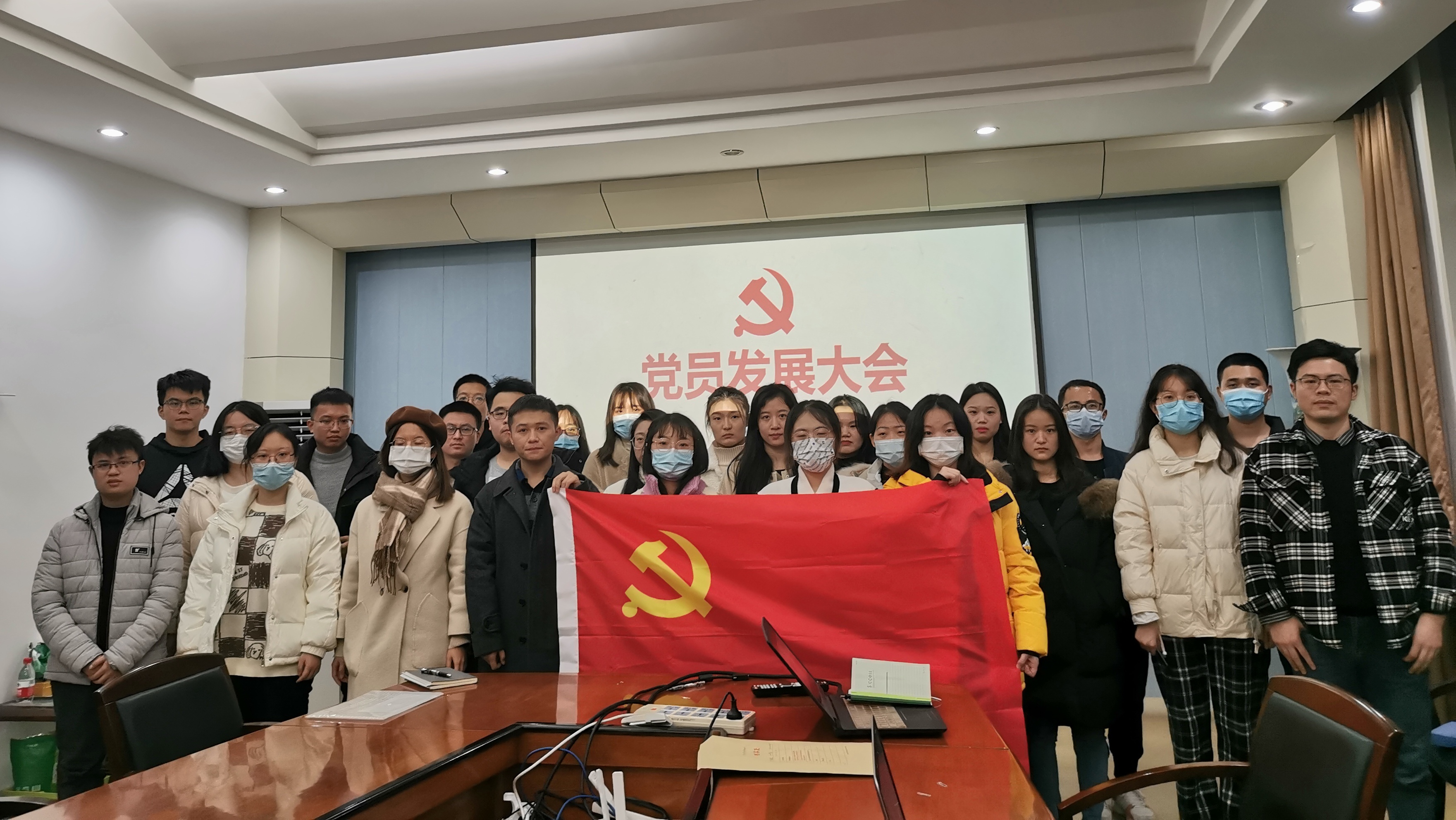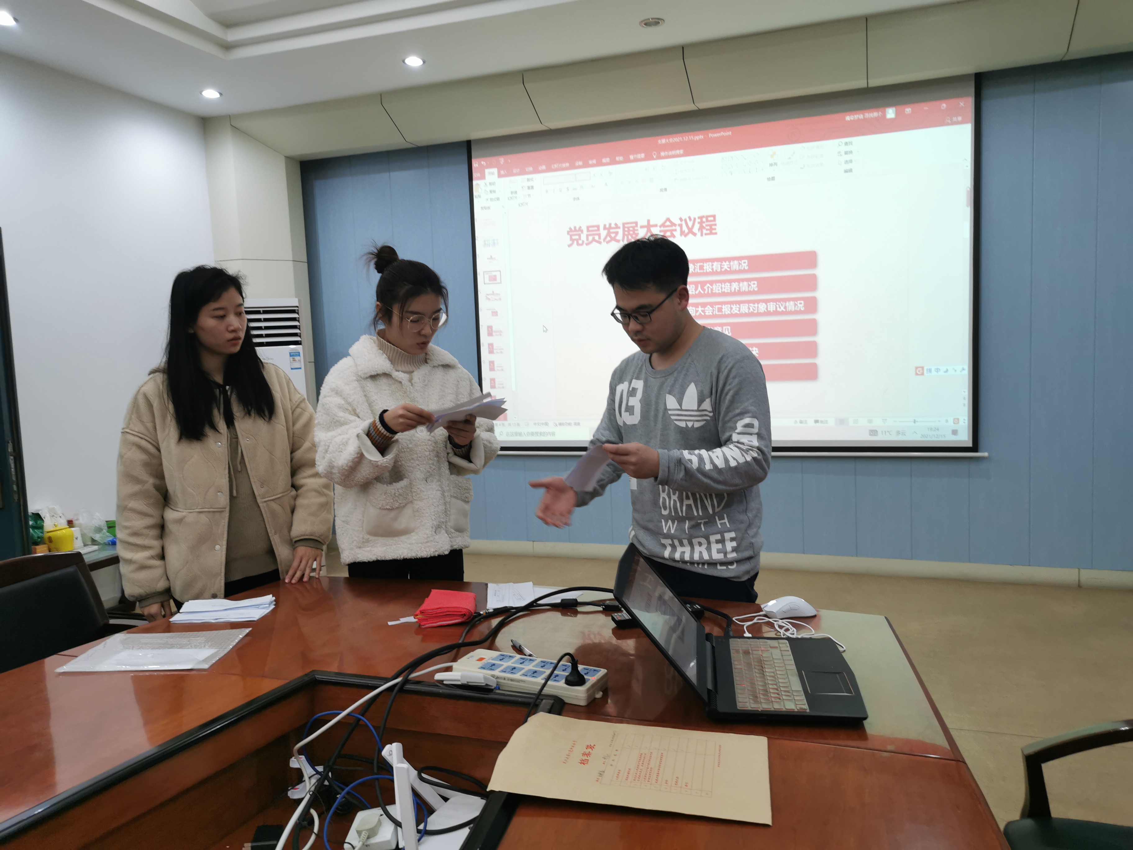 会议第一项议程是讨论接收秦旭寰、张鹏鑫同志为预备党员的问题。按照会议流程,秦旭寰、张鹏鑫两位发展对象分别向党组织汇报了自己对党的认识、入党动机、近期表现等情况。两位同志的入党介绍人也分别对其在政治觉悟、思想品质、学习工作表现等各方面进行汇报,并表示同意其发展党员。