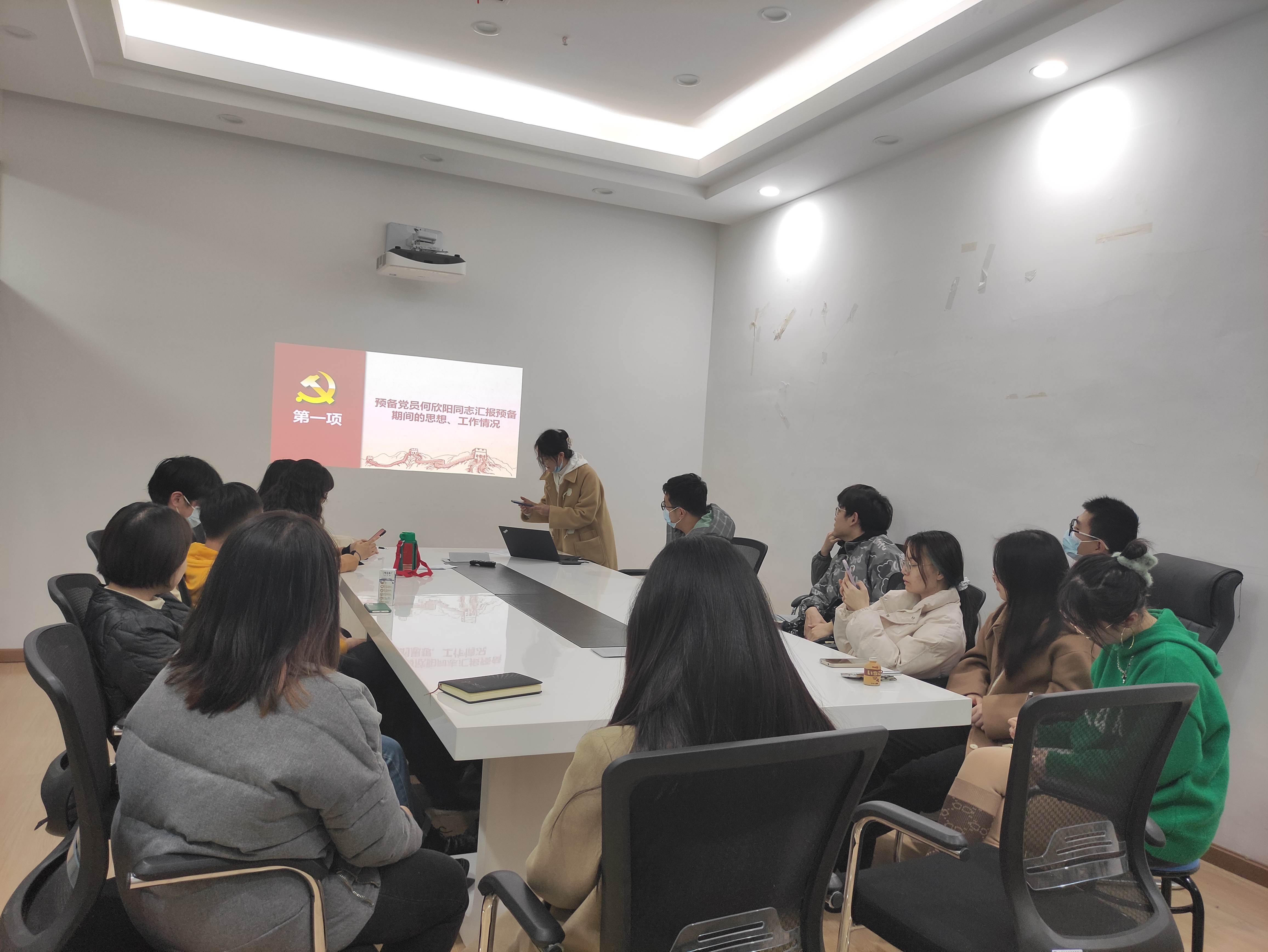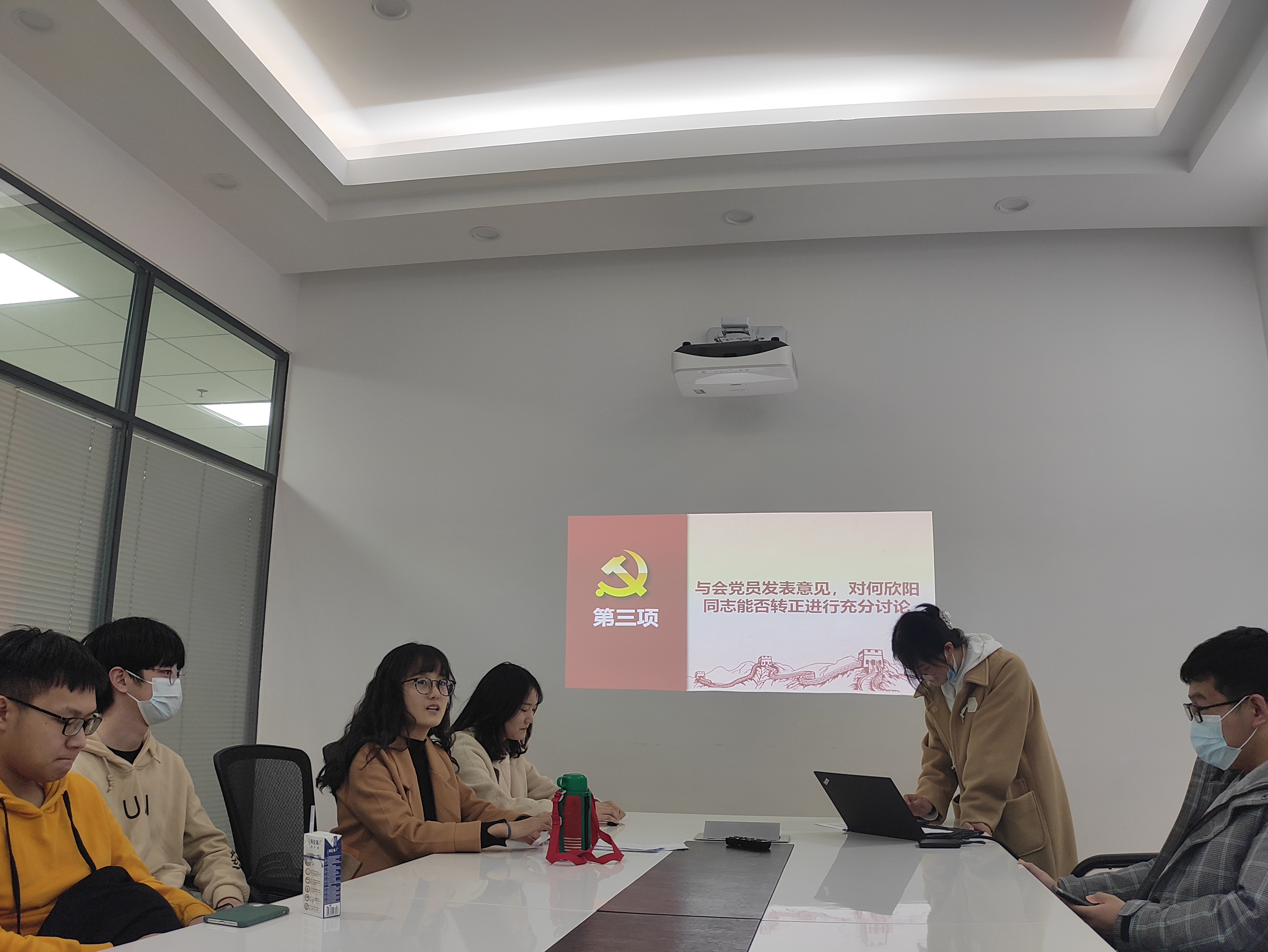 会议第二项,讨论何欣阳同志的转正工作。首先由预备党员何欣阳同志汇报预备期间的思想和工作情况;之后由组织委员辛成同志代表支部委员会报告何欣阳同志预备期间的教育考察情况。