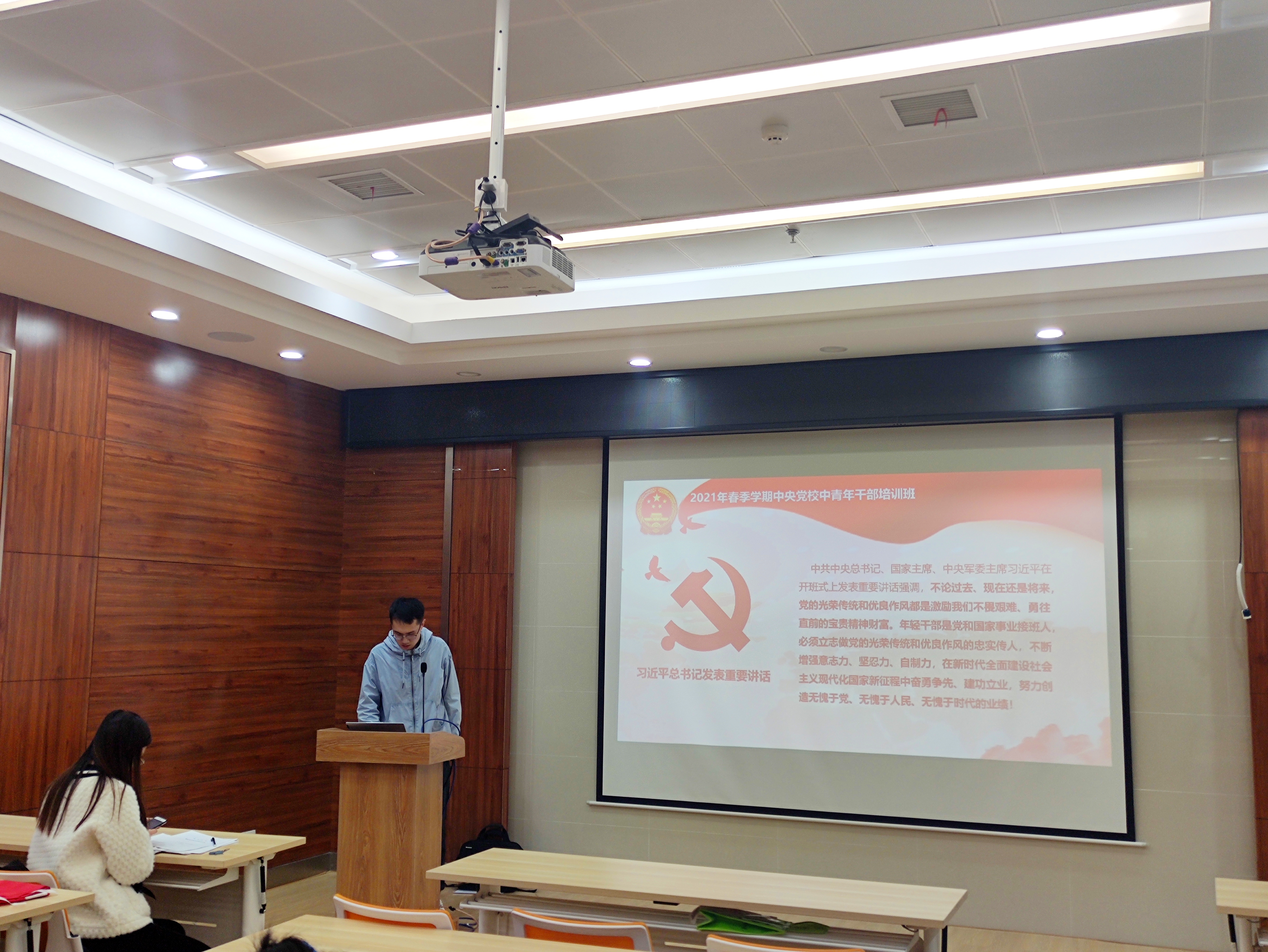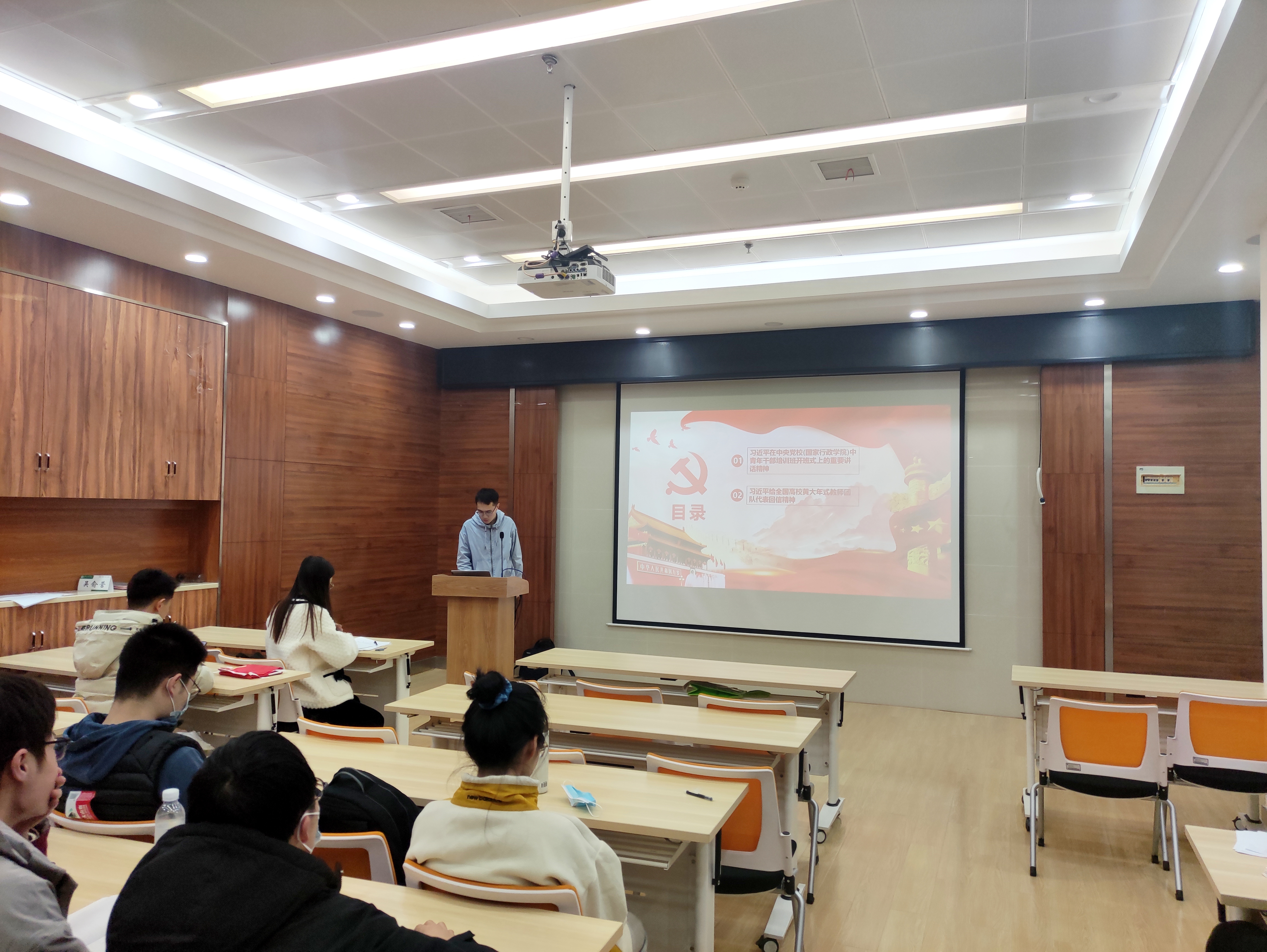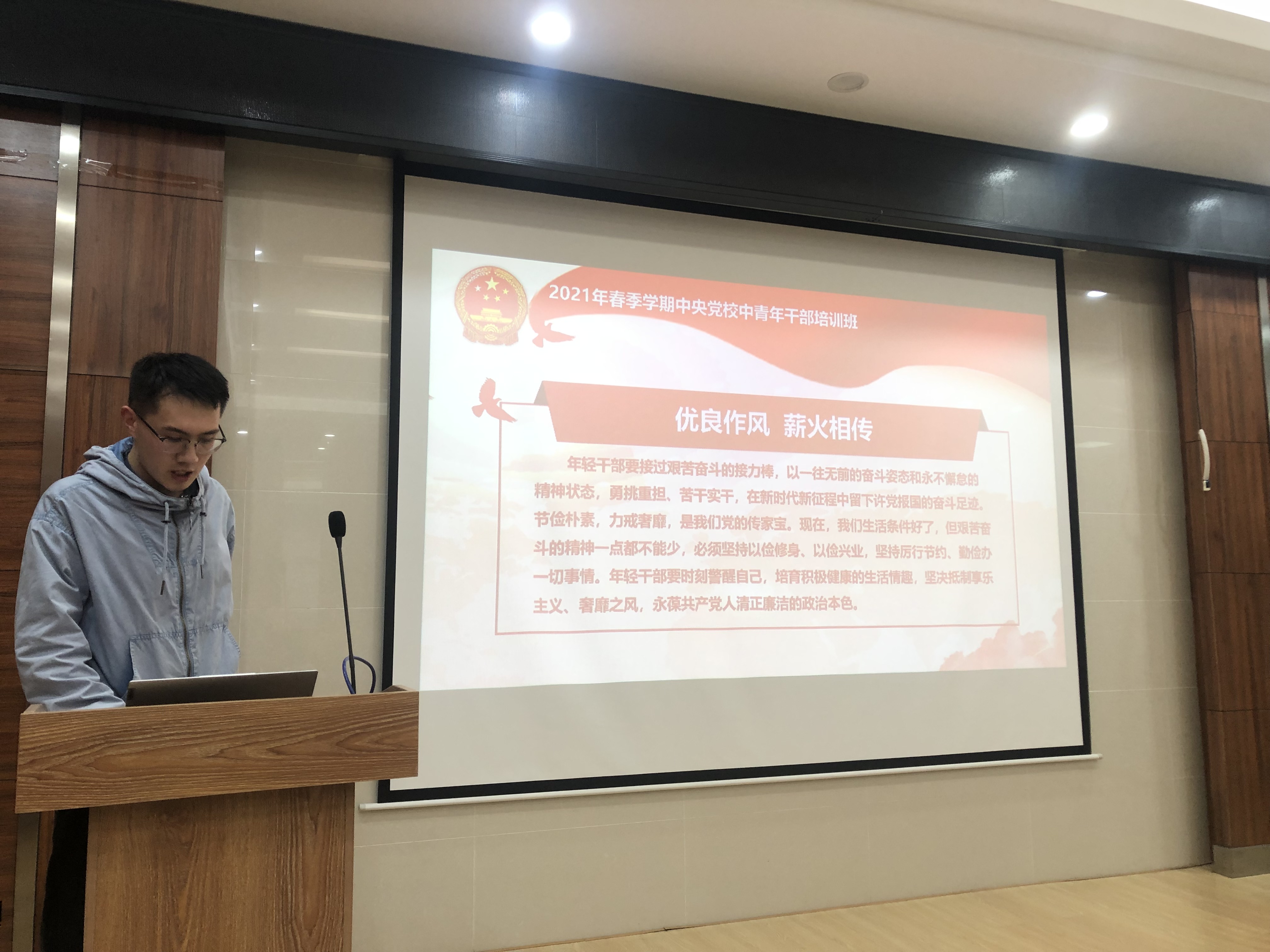 张铭浩同志围绕习近平在中央党校(国家行政色情直播app)中青年干部培训班开班式上的重要讲话精神、习近平给全国高校黄大年式教师团队代表回信精神、习近平致新华社建社90周年的贺信展开介绍,强调作为新时代的青年,我们必须坚持以俭修身,继承并发扬艰苦奋斗的精神,永葆共产党人清正廉洁的政治本色。