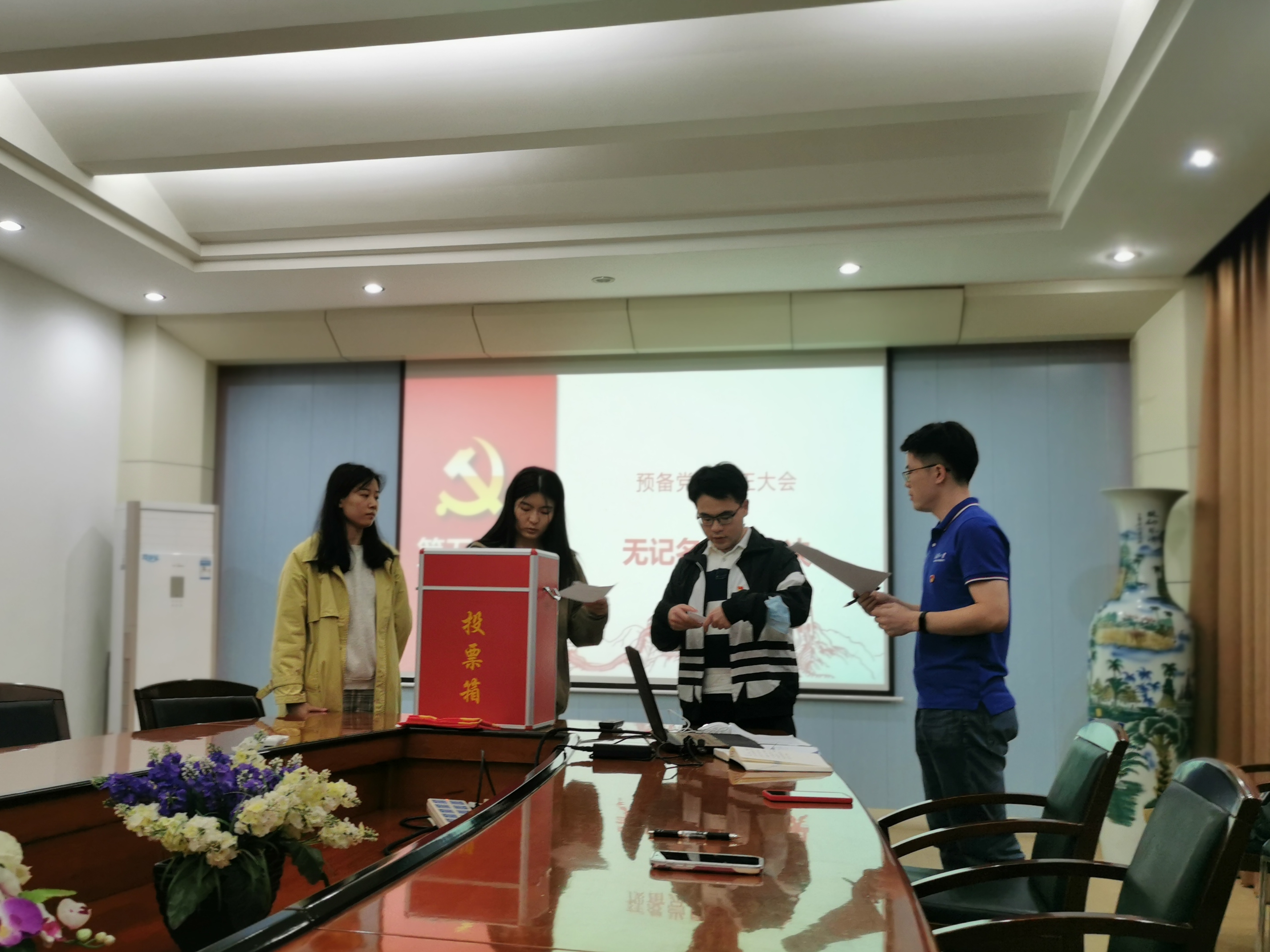 接下来,曾珍同志的培养考察人王萌同志汇报了考察情况,对曾珍同志预备期间的各方面表现给予了肯定,同意其按期转正。然后,由郑传帮同志代表支委会向支部大会报告对曾珍同志的教育考察情况,认为曾珍同志符合转正条件。与会党员也对曾珍同志的转正申请进行了充分的讨论。随后由正式党员进行无记名投票并现场公示投票结果,经表决,曾珍同志得到党支部大会的一致认可,同意其按期转为正式党员。