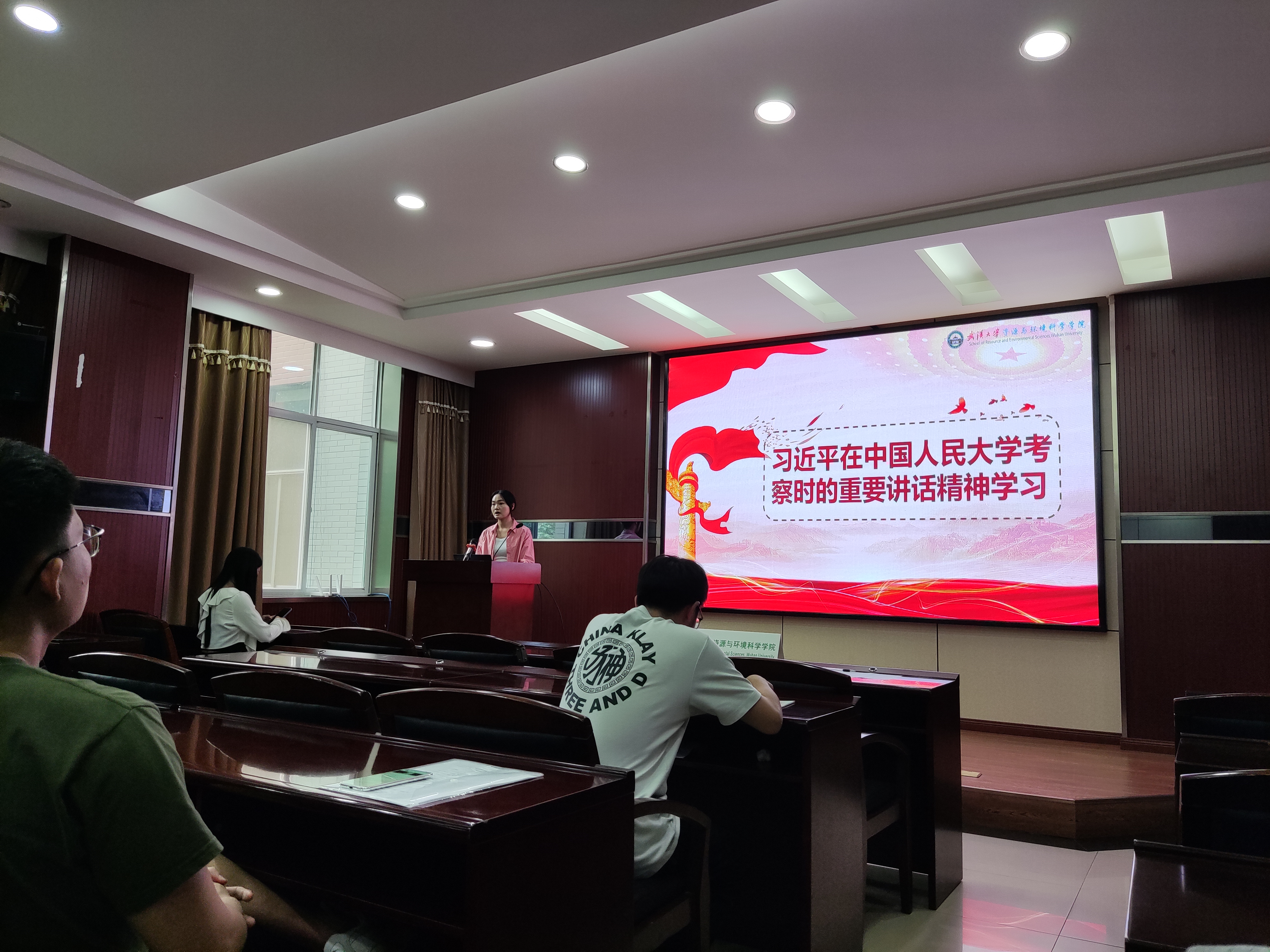 会议第二项,支部宣传委员陈慧婷领学习近平总书记在中国人民大学考察时的重要讲话精神。此次学习从一段影片开始,重温五四运动,对五四青年节的主题精神“爱国、进步、民主、科学”有了深层次的领悟。她将国家前途命运与个人成长发展紧密结合,从小我中感悟大我,深刻领会习近平总书记对当代中国青年的希望。与会成员纷纷响应号召,作为新时代青年立志民族复兴,不负韶华,不负人民,争取在青春的赛跑上跑出当代青年的最好成绩。