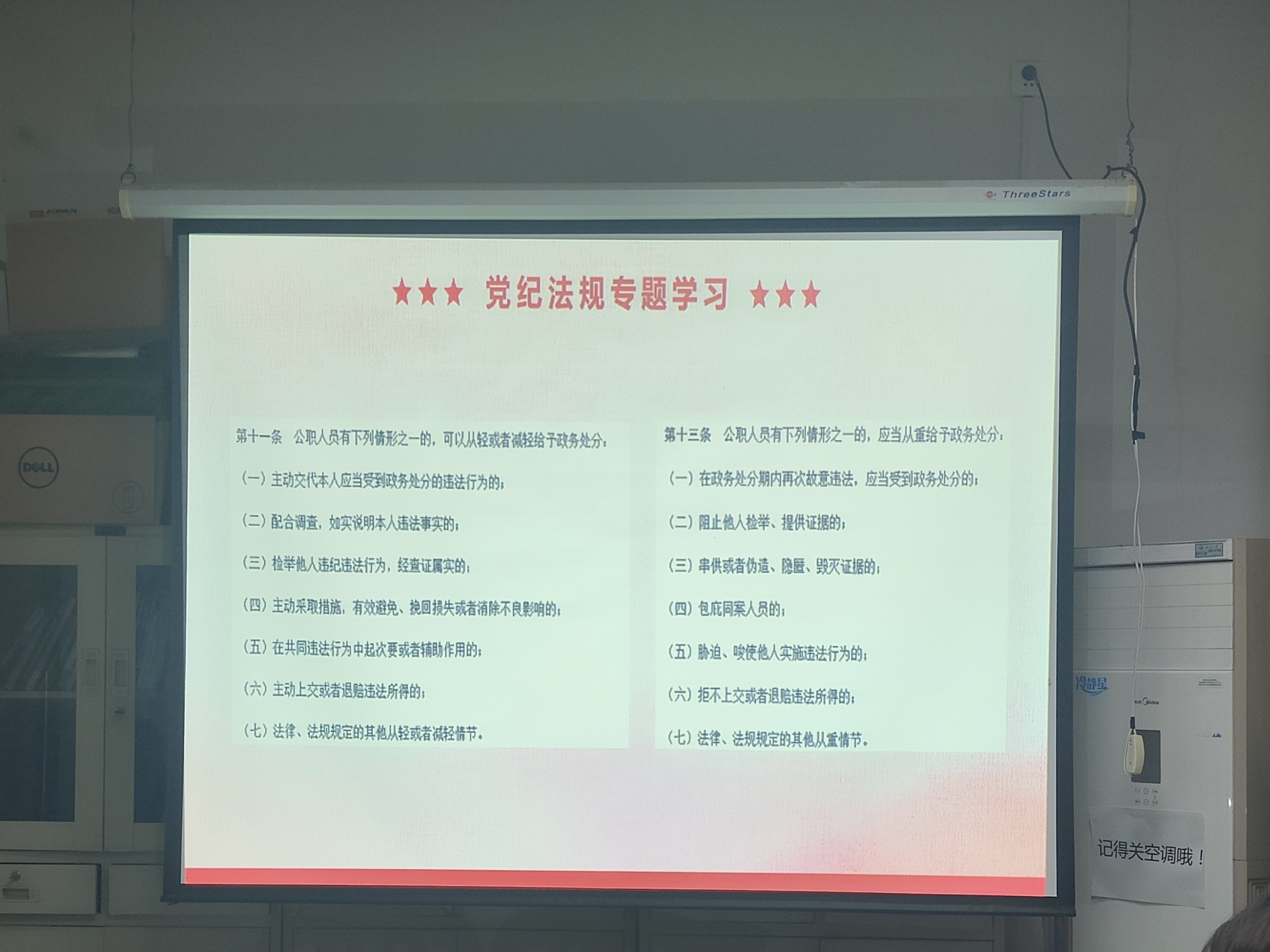 会议第二项,党风廉政建设宣传教育。周亚娟同志以“大力弘扬清廉守正、担当务实之风”为活动主题,深入学习党章党规党纪和国家监察法律法规,介绍了党章、《中国共产党纪律检查委员会工作条例》、《中华人民共和国监察法》及其实施条例、《中华人民共和国政务处分法》等党内法规和法律法规知识,学习了党员的权利与义务,解读法条,并结合经典案例,漫画等形式深入浅出的讲述了法规知识。周亚娟同志指出,同志们要筑牢思想道德防线,明底线、知敬畏。