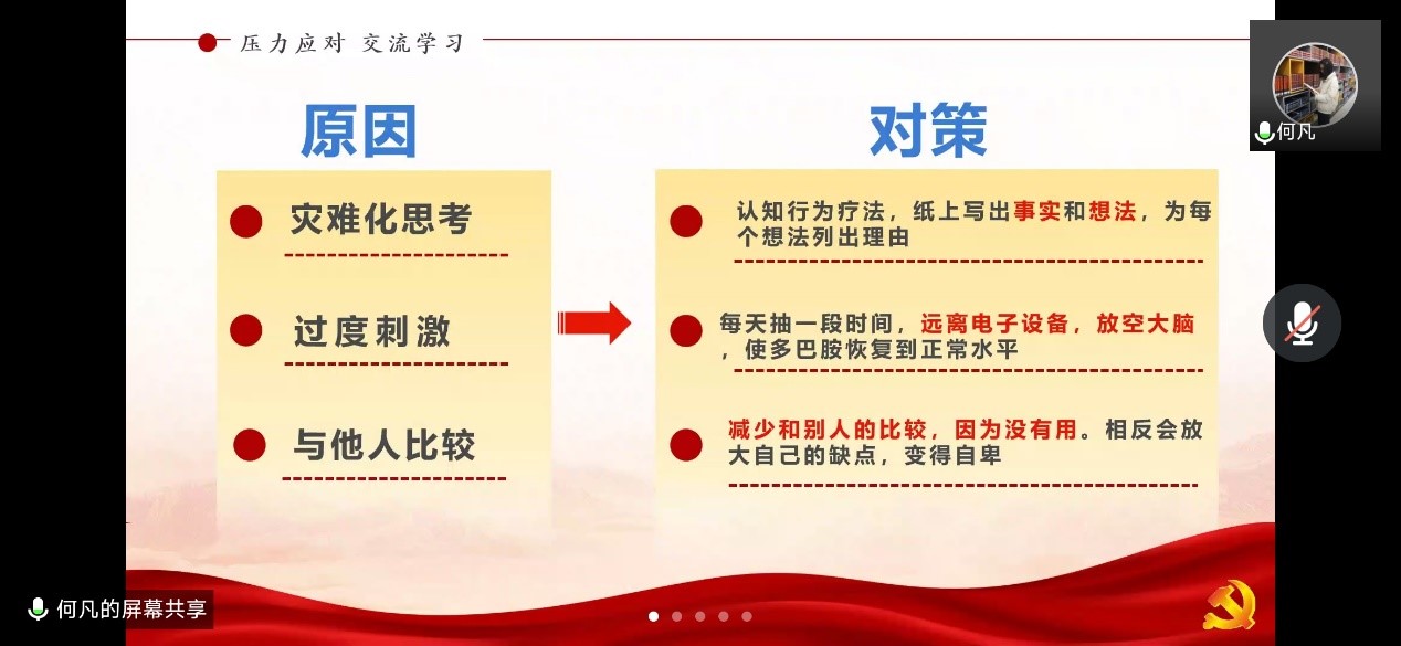 会议第二项,进行“告别内耗 压力应对” 学习交流。同志们共同观看学习视频《总是胡思乱想、心累、焦虑?如何停止精神内耗?》。视频深入浅出地介绍了心理内耗的原因与相应对策。随后,何凡同志在总结科普视频重点内容的基础上,详细介绍了校内心理疏解途径,建议同志们有需要时通过“学生心理服务”寻求专业人士的帮助,同时积极参与心理健康活动。