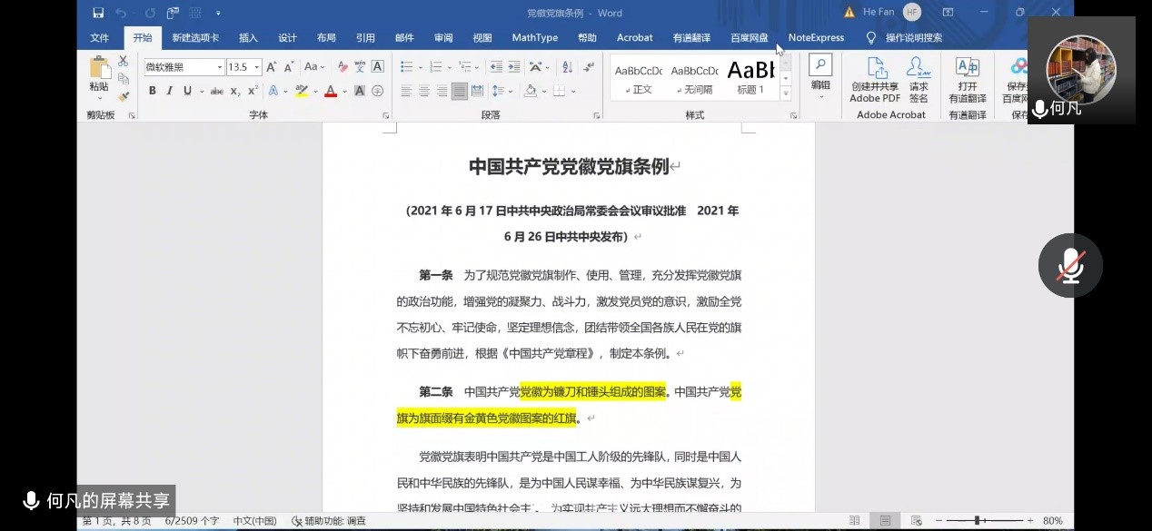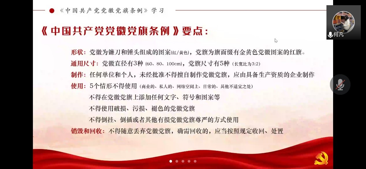 会议第一项,何凡同志带领支部同志学习《中国共产党党徽党旗条例》。首先,何凡同志展示了《中国共产党党徽党旗条例》的原文,结合生活实际重点讲解了第二条、第五条、第八条、第十四条、第十八条等条目。紧接着,同志们针对《中国共产党党徽党旗条例》要点进行回顾与记忆,包括党徽党旗的形状颜色、通用尺寸及制作、使用、回收的规范等。最后通过抽签问答的方式,用若干练习题考察了同志们对《条例》的掌握情况,支部同志反馈良好。