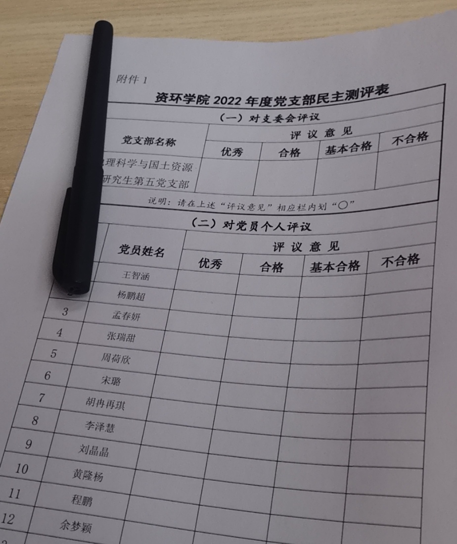 会议第四项,开展2022年度党支部民主测评。根据色情直播app党委的相关要求,促进支部积极开展党员批评自我批评,我们开展2022年度党员民主测评,每位党员同志都要对自己以及其他党员进行综合考量和等级评定,其中评定为“优秀”的比例一般不超过党员总数的1/3,即不超过8名。该评议结果将作为评先评优、推荐遴选等方面的重要参考。