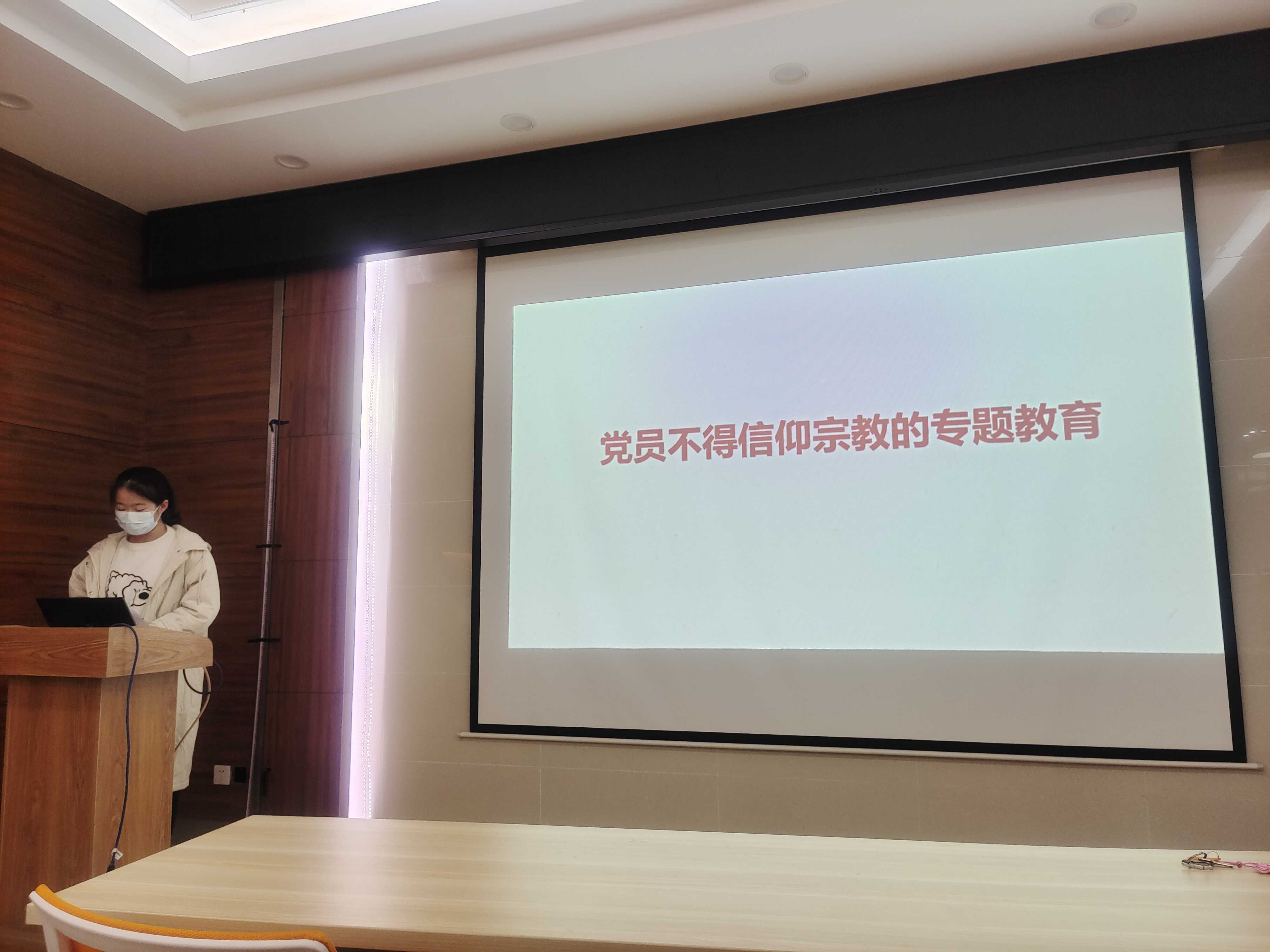 会议第五项,开展党员不得信仰宗教的专题教育党日活动。支部书记周宇氚同志带领大家观看了党员不得信仰宗教的专题教育学习视频秦坤同志指出党员如果信教,就会导致唯心主义和唯物主义、有神论和无神论的碰撞,从而导致我党在党政方针政策的制定和执行上存在严重分歧,不利于党的集中统一领导,客观上阐述了党员信教的危害;王浩同同志呼吁全体党员不得信仰宗教,但要树立马克思主义宗教观,教育引导各族信教与不信教、信仰不同宗教的群众紧跟时代步伐,共同团结奋斗、共同繁荣发展,不断推进中华民族共同体建设,在服务社会、贡献国家中汇入建设社会主义现代化强国的历史洪流。