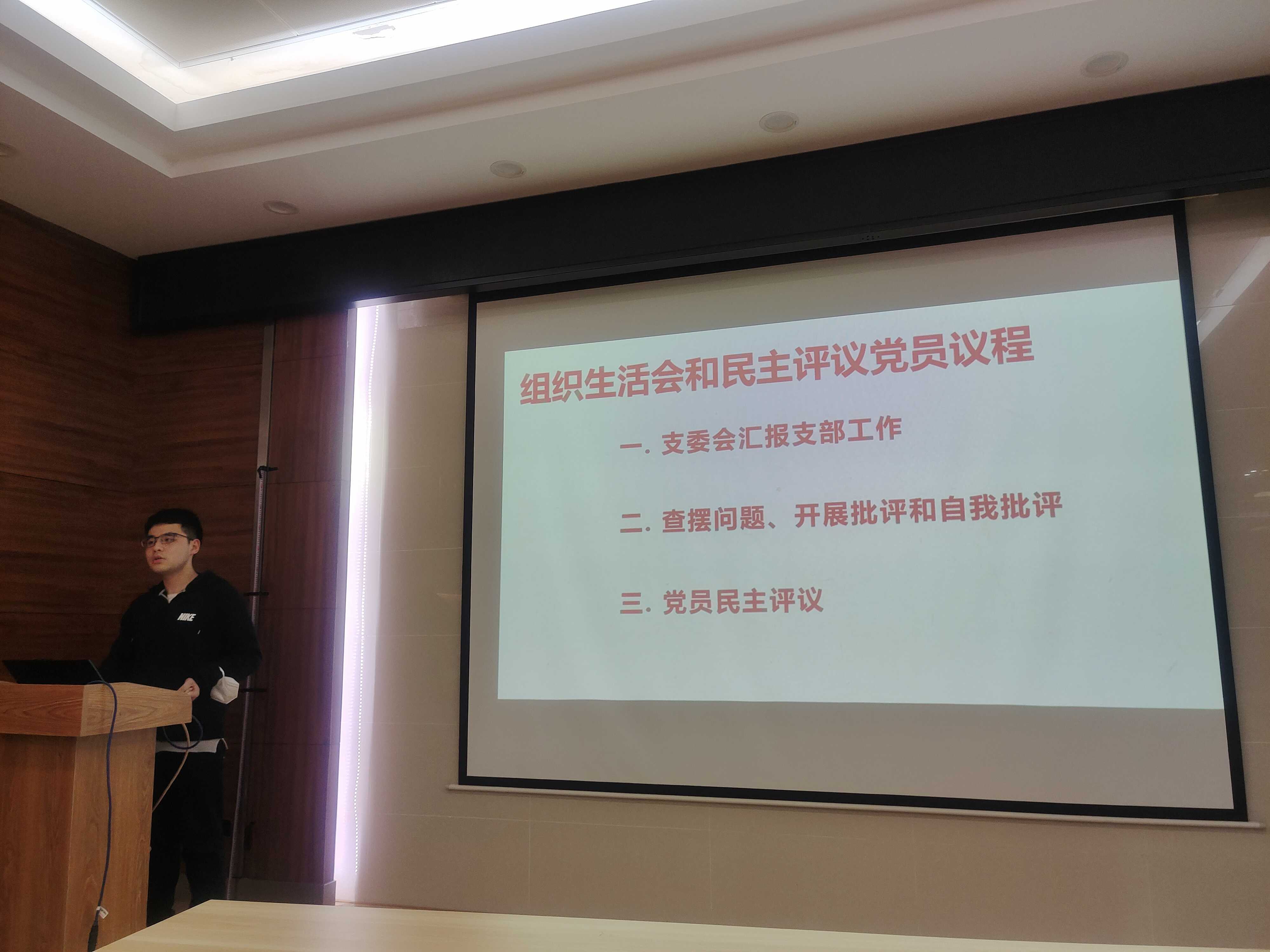 会议第一项,支部工作汇报。由支部书记周宇氚同志汇报上半年支部活动开展情况,主要从支部常态化建设工作落实、党员发展、严格组织生活、党史学习教育等四个方面做了详细的阐述。支部在一年内接收了1名同志的入党申请书并确定为积极分子、确定了2名同志成为发展对象、吸收了2名同志入党以及转正了4预备党员;支部严格落实三会一课制度,一年内支部共开展6次支委会,4次支部大会,进行了1次党课学习;在日常中建立了党员花名册与荣誉库,落实了请假制度,并按时记录了各位党员的活动参与出席情况。同时,对支部工作中存在的问题进行了总结反思,主要包括组织学习方式太单调、缺乏创新性,并建议在支部内部开展调研、集思广益,调动学习积极性。