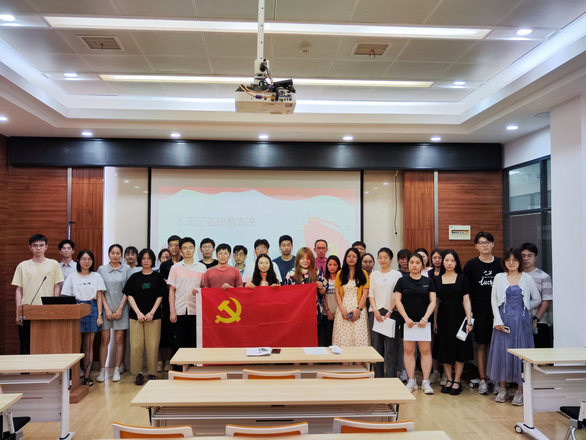 经过支部成员的充分讨论后,焦丹同志为到场的各位正式党员发放表决票,采用无记名方式进行投票表决,最终收回的24张表决票均同意接收姜涛、朱邵聪与苏恒同志成为预备党员,赞成票超过参与表决人数的一半,本次表决有效。姜涛同志感谢了各位党员对自己的支持和认可,表示自己在今后会牢记自己的党员身份,继续努力学习,更加严格要求自己;朱邵聪同志表示,在以后的生活中会更加积极学习党的先进理论知识来武装自己,充分学习老一辈共产党员与身边优秀党员的优点;苏恒同志表示会议党员的标准来严格要求自己,尽自己的能力去帮助他人,团结身边的人,加强思想和世界观的改造。
