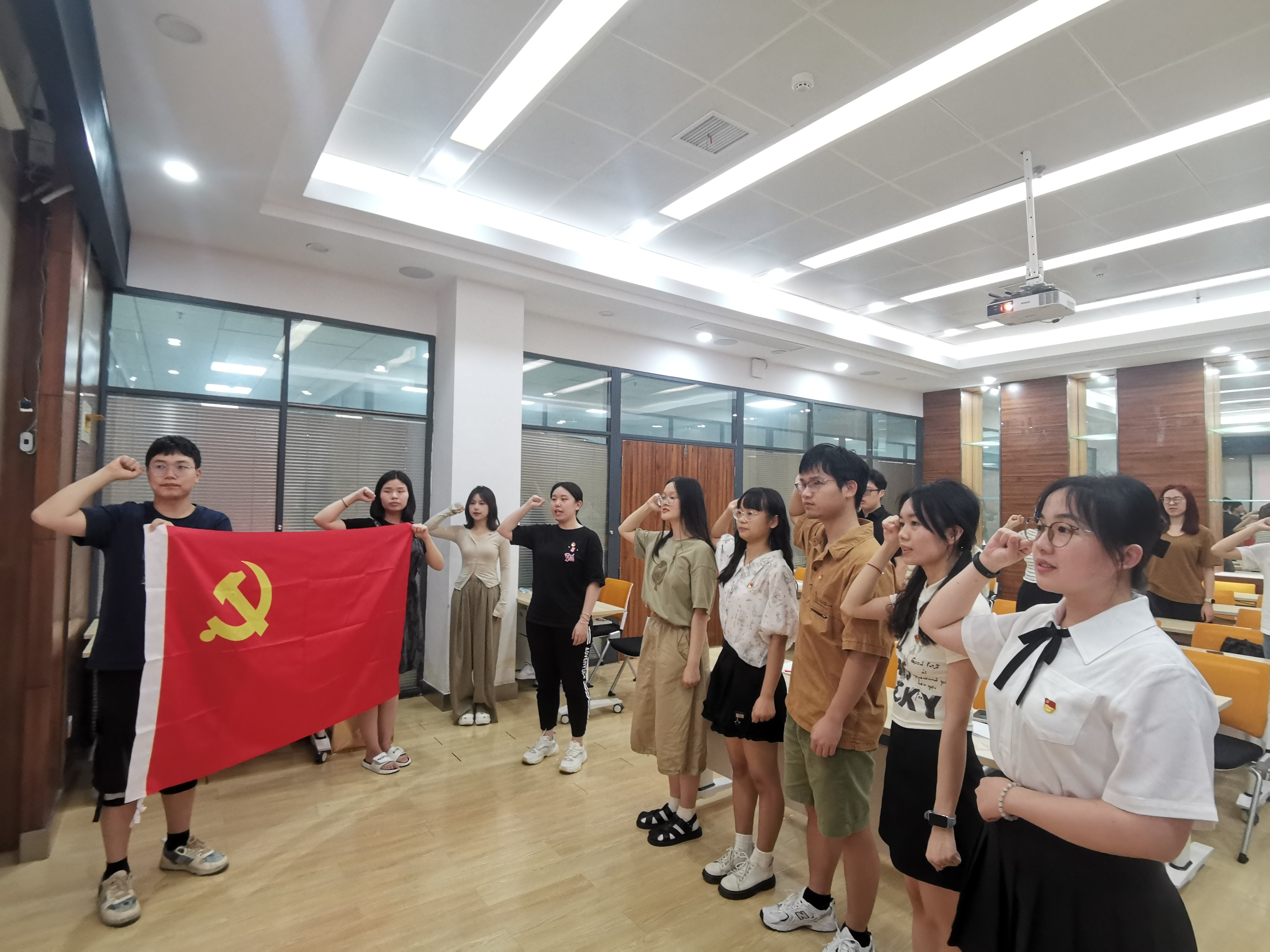 最后,经支部委员会研究,由胡冉再琪同志为监票人、王佳雪同志为计票人,组织与会的正式党员就五位同志的接收问题进行了现场无记名投票。最后由孟春妍同志宣布决议,同意接收其为预备党员。其后,林斐菲、张哲乐、钟新润、吴雨、黄欣同志依次进行表态,向党组织表达了自身的决心与信心,并在孟春妍同志的带领下面对完成了入党宣誓表示。
