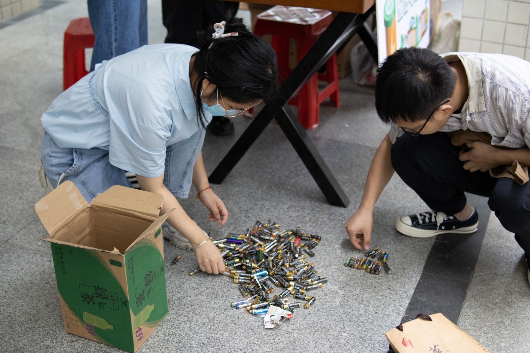 时至中午,食堂人流逐渐增多,回收站点吸引了大家的目光,不少同学、老师、居民相继拿来废旧电池支持环保回收活动。大家纷纷表示,听说过废旧电池危害不小就一直不敢随便丢弃,但也没有渠道回收只能攒着,能够举办这样的活动真是太好了,让有害物品能够回收再利用。有老师回家搬来271节电池,有同学奔走相告招呼亲朋好友来回收站点捐赠废旧电池,也有同学放下电池就走做好事不留名。在大家的热情支持下,电池数量逐渐累积,本来已经“油尽灯枯”的废旧电池重新有了别样的价值。