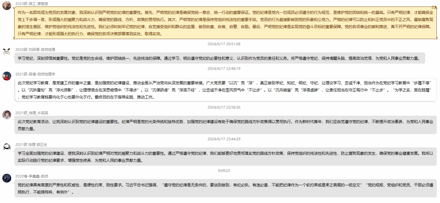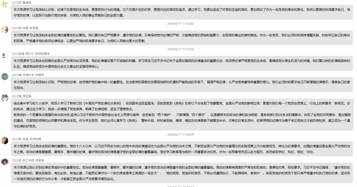 在集体讨论环节,支部成员踊跃发言,对本次学习内容进行了深入交流与思考。牛笑笑同志谈到:“此次党纪学习教育,让我深刻认识到党的纪律建设的重要性。纪律严明是党的光荣传统和独特优势,加强党的纪律建设有助于确保党的路线方针政策得以贯彻执行。”廖慧慧同志说:“作为一名即将成为党员的发展对象,我深刻认识到严明党的纪律的重要性。首先,严明党的纪律是确保党统一意志、统一行动的重要保证。党的纪律是党内一切成员必须遵守的行为规范,是维护党的团结和统一的基础。”李鑫鑫同志说:“党的纪律具有高度的严肃性和权威性,是硬性约束、刚性要求。”
