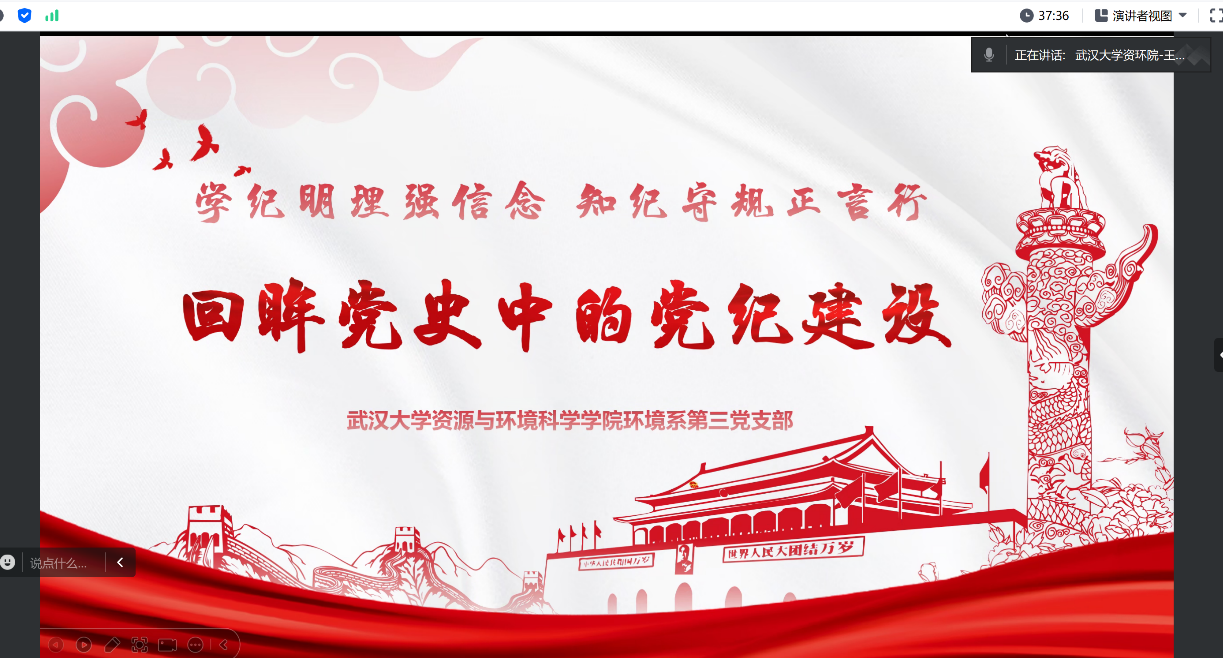 环境科学与工程系研究生第三党支部王韵涵同志分享党纪条例的修订历程。在宣讲中,她系统深入地介绍了《中国共产党纪律处分条例》的修订历程,阐述了党纪学习教育在不同历史时期的重要作用,及其在党的建设中的历史地位。