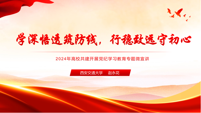 活动的第一部分由西安交通大学能动色情直播app澎湃宣讲团成员/硕3059党支部书记赵永花带来《学深悟透筑防线,行稳致远守初心》的主题宣讲。通过电视剧《狂飙》引入党纪学习教育的重要意义,并详细介绍了党纪学习教育的内容和要求,进一步深化对加强党的纪律建设重要性和忽视党纪、违犯党纪问题危害性的认识。